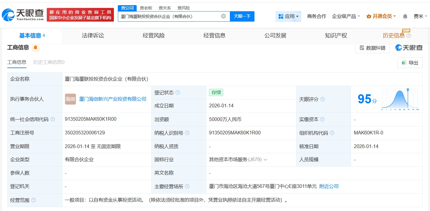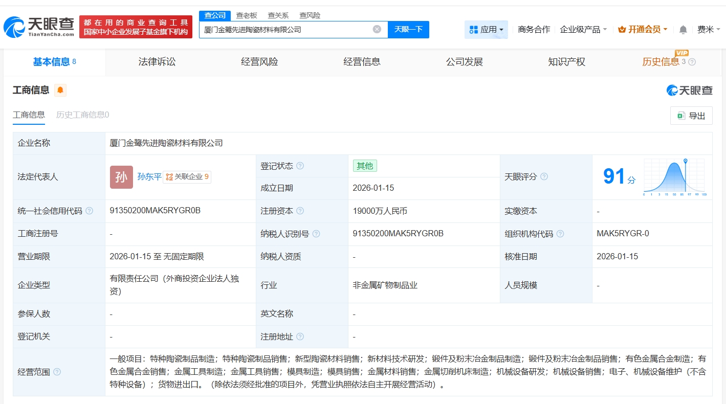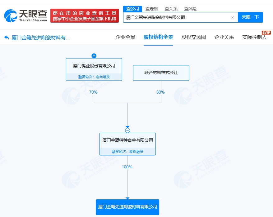 雷达财经讯,天眼查工商信息显示,1月15日,厦门金鹭先进陶瓷材料有限公司成立,法定代表人为孙东平,注册资本1.9亿人民币,经营范围包括特种陶瓷制品制造、特种陶瓷制品销售、新型陶瓷材料销售、新材料技术研发等。股权全景穿透图显示,该公司由厦门金鹭特种合金有限公司全资持股,后者由厦门钨业(600549)和联合材料株式会社分别持股70%、30%。