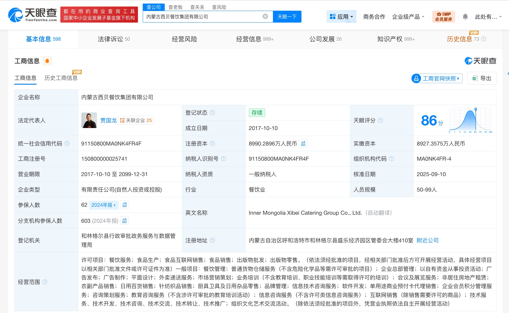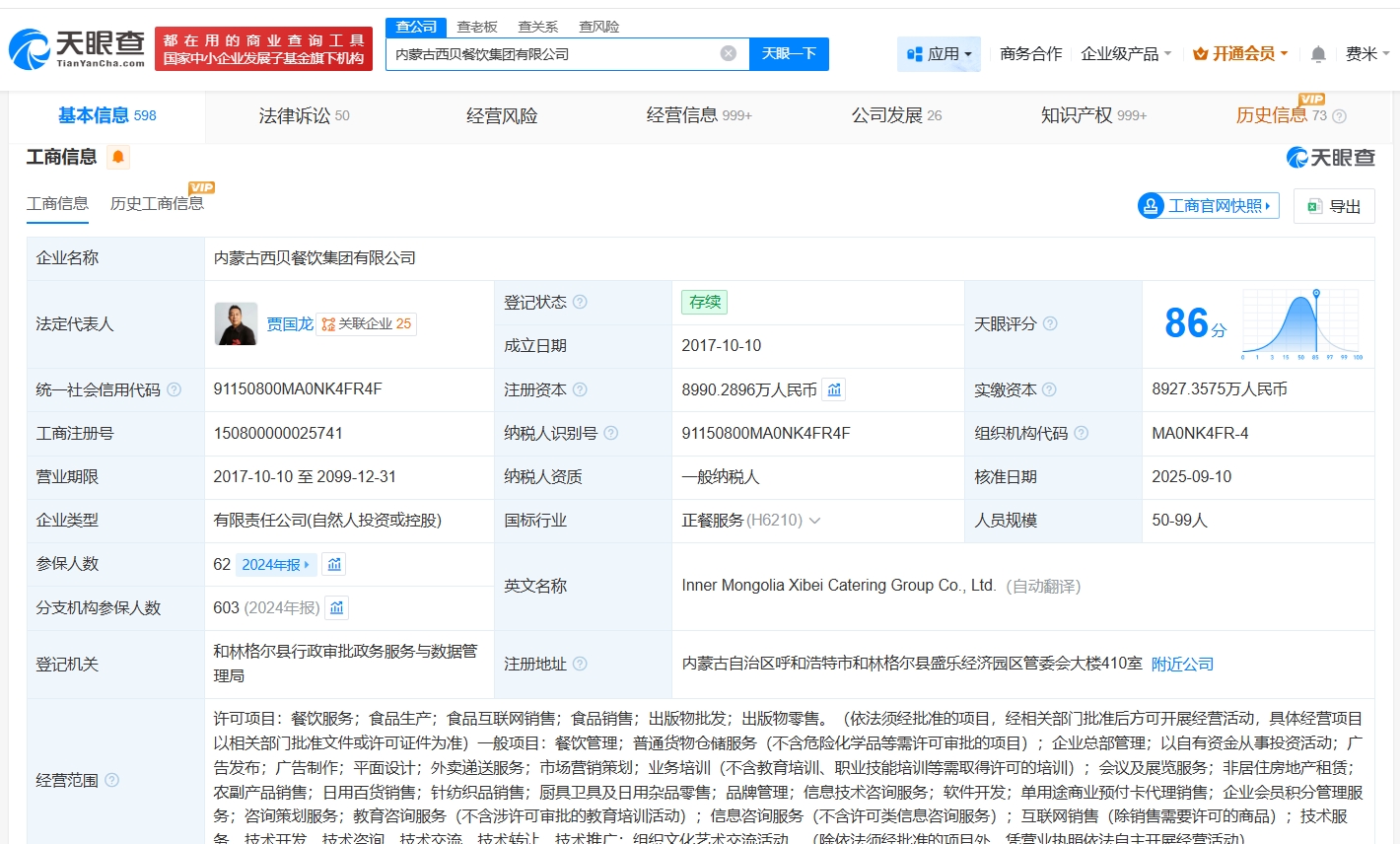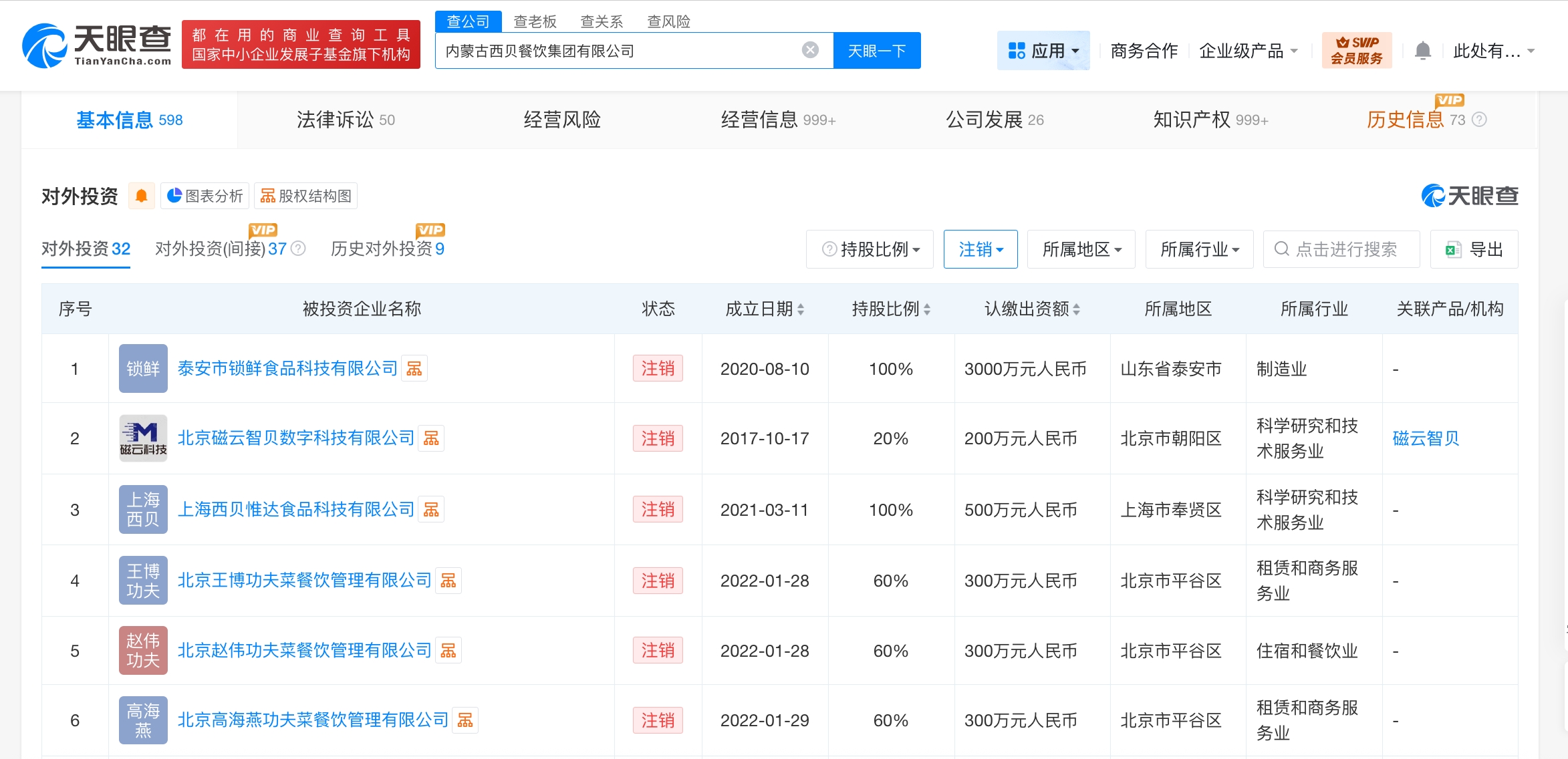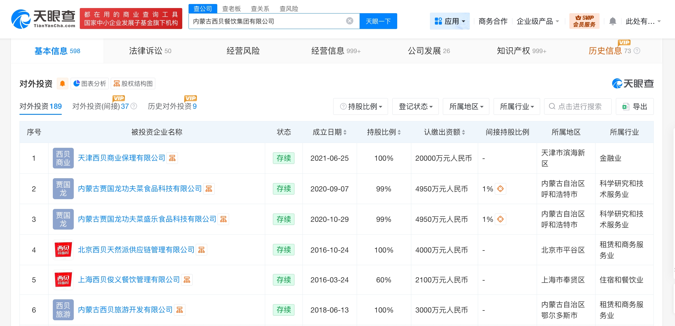 雷达财经讯,据媒体报道,近日,网传西贝会议中称将一次性关闭全国102家门店,占门店总数的30%。1月15日,西贝餐饮创始人贾国龙确认该消息属实。2025年9月,西贝遭遇“预制菜风波”,贾国龙称之为西贝成立以来最大的一次外部危机。 天眼查工商信息显示,西贝关联公司内蒙古西贝餐饮集团有限公司成立于2017年10月,法定代表人为贾国龙,注册资本约8990万人民币,经营范围含餐饮服务、食品生产、食品互联网销售、食品销售、餐饮管理、普通货物仓储服务、以自有资金从事投资活动等。股东信息显示,该公司由北京西贝企业管理有限公司、贾国龙、呼和浩特市人生喜悦企业管理中心(有限合伙)等共同持股。对外投资信息显示,该公司直接持股近190家企业,其中150余家企业为存续状态,30余家企业已注销。 此外,西贝另一家关联公司北京西贝餐饮管理有限公司成立于2001年11月,法定代表人为贾国龙,注册资本800万人民币,经营范围为出版物零售、餐饮管理,由贾国龙、张丽平共同持股。 值得一提的是,近期,西贝旗下多家企业注销,包括北京西贝畅行寰宇餐饮管理有限公司、上海西贝麦香餐饮管理有限责任公司等。