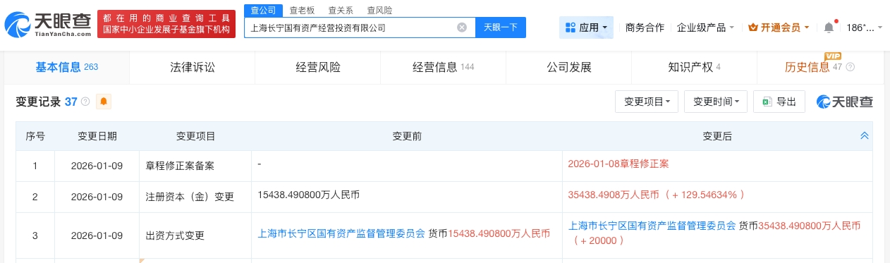 雷达财经讯,天眼查工商信息显示,近日,上海长宁国有资产经营投资有限公司发生工商变更,注册资本由约1.54亿人民币增至约3.54亿人民币,增幅约130%。 该公司成立于2009年6月,法定代表人为谢珂,经营范围含国有资产经营管理、资本运作、实业投资、资产收购、包装和出让、企业和资产托管、债权债务重组等。股东信息显示,该公司由上海市长宁区国有资产监督管理委员会(上海市长宁区集体资产监督管理委员会)全资持股。