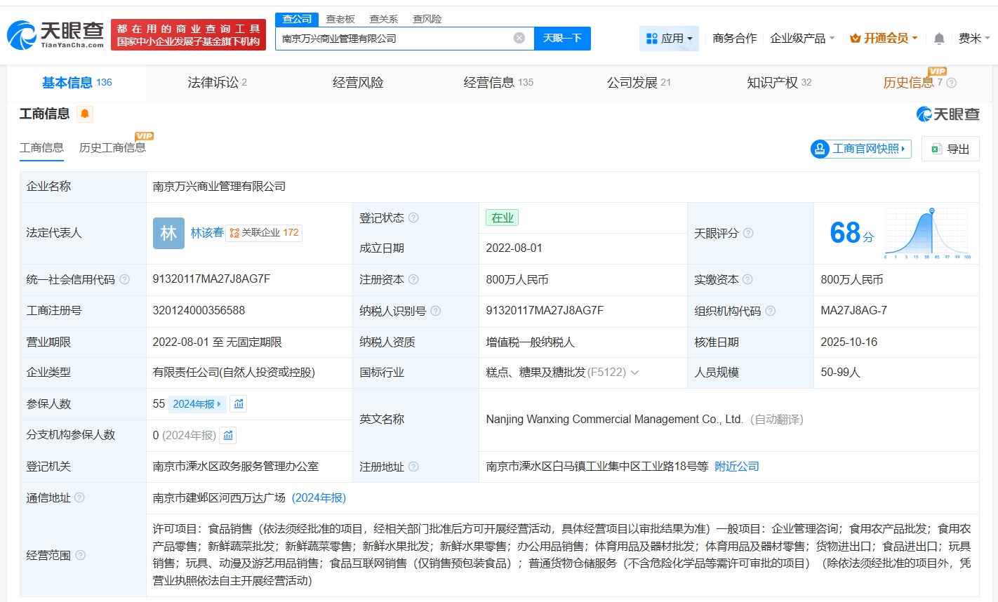 天眼查App显示,好想来关联公司南京万兴商业管理有限公司成立于2022年8月,法定代表人为林该春,注册资本800万人民币,经营范围包括食品销售、企业管理咨询、食用农产品批发、食用农产品零售等,由万辰生物(300972)、王泽宁共同持股。对外投资信息显示,该公司对外投资12家公司,其中11家处于存续状态。法律诉讼信息显示,该公司曾因买卖合同纠纷被起诉。