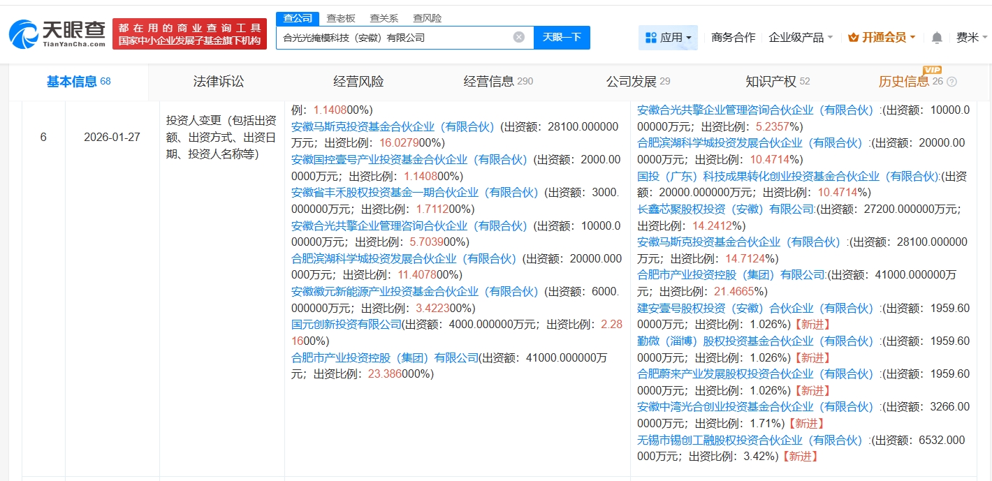 雷达财经讯,天眼查App显示,近日,合光光掩模科技(安徽)有限公司发生工商变更,新增勤微(淄博)股权投资基金合伙企业(有限合伙)、蔚来资本旗下合肥蔚来产业发展股权投资合伙企业(有限合伙)等为股东,张理想卸任法定代表人,由方炜接任,同时,注册资本由约17.5亿人民币增至约19.1亿人民币。