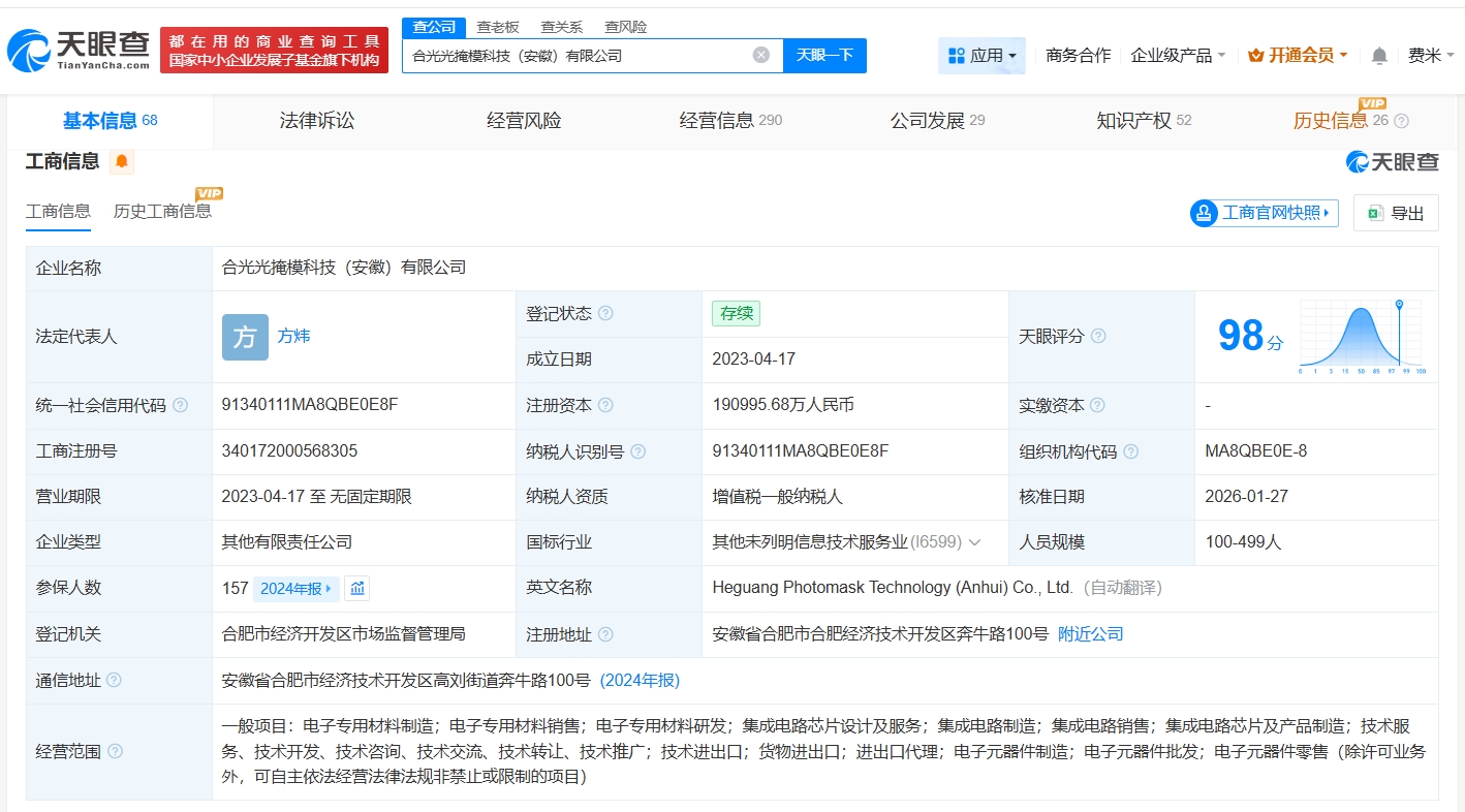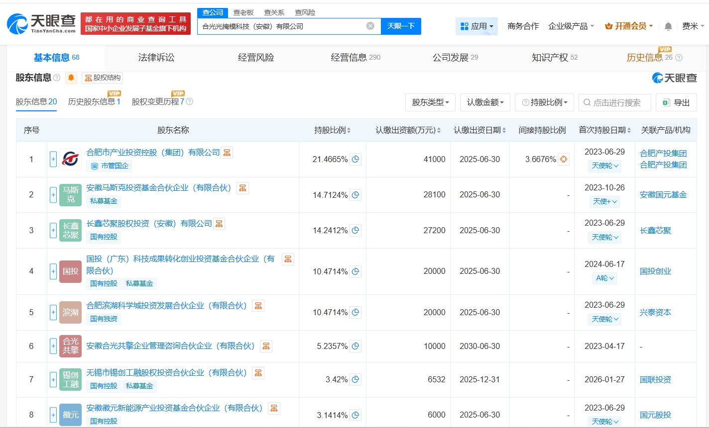 该公司成立于2023年4月,经营范围包括电子专用材料制造、电子专用材料销售、电子专用材料研发等,现由合肥市产业投资控股(集团)有限公司、安徽马斯克投资基金合伙企业(有限合伙)及上述新增股东等共同持股。官网显示,该公司主要从事掩模板的研发、设计、生产和销售业务。