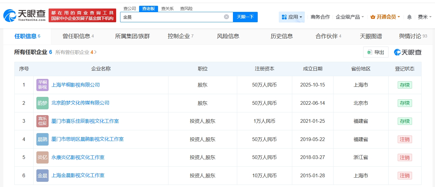 天眼查App显示,金晨名下关联6家企业,其中3家为存续状态,包括上海芊桐影视有限公司、北京韵梦文化传媒有限公司等。值得一提的是,此前,金晨名下厦门市思明区晨鹃影视文化工作室的登记状态由存续变更为注销。