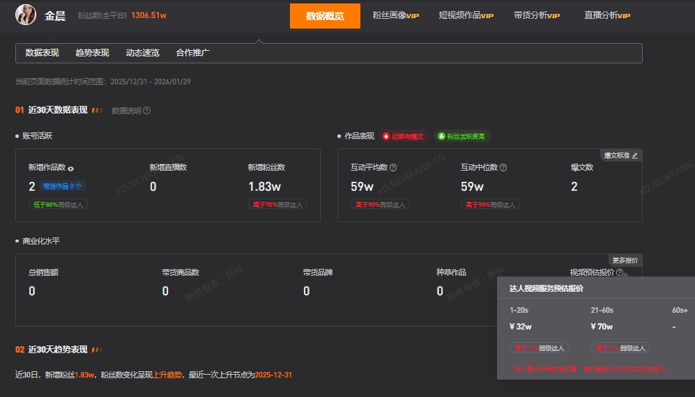 第三方数据显示,截至1月30日下午5点,金晨现有粉丝1306.8万,视频平台账号近30日涨粉1.83万。商业化水平显示,其1-20s、21-60s视频预估报价分别为32万、70万。