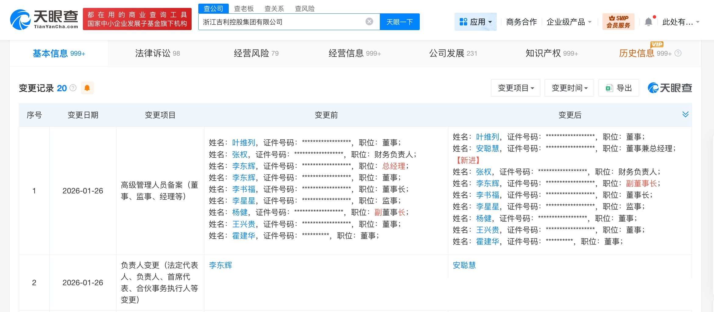 雷达财经讯,天眼查工商信息显示,近日,浙江吉利控股集团有限公司发生工商变更,李东辉卸任法定代表人并由总经理、董事改任副董事长,由安聪慧接任法定代表人并担任董事兼总经理,同时,部分高管发生变更。