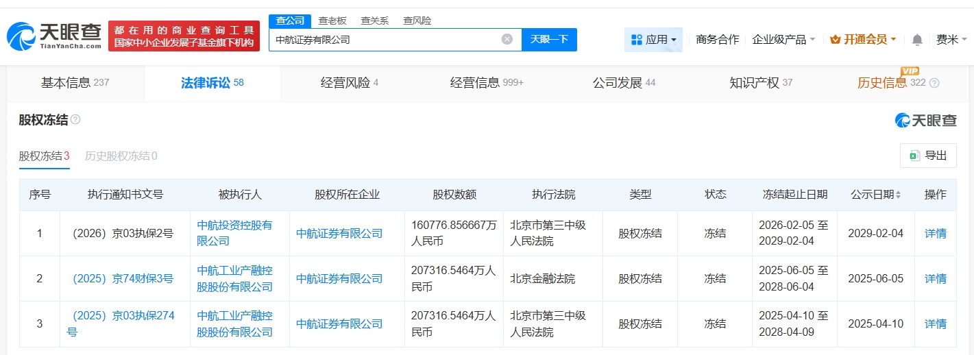 雷达财经讯,天眼查法律诉讼信息显示,近日,中航证券有限公司新增一则股权冻结信息,被执行人为中航投资控股有限公司,冻结股权数额约16.1亿人民币,冻结期限为3年,执行法院为北京市第三中级人民法院。