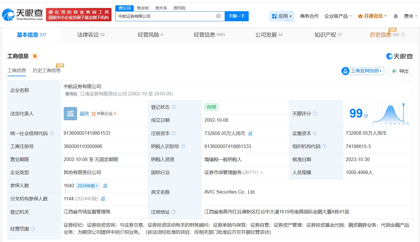 该公司成立于2002年10月,法定代表人为戚侠,注册资本约73.3亿人民币,经营范围包括证券经纪、证券投资咨询、证券承销与保荐等,由中航投资控股有限公司、中航工业产融控股股份有限公司共同持股。