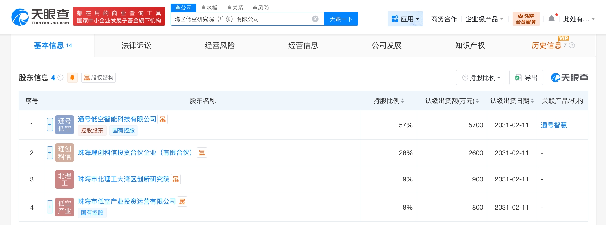 雷达财经讯,天眼查App显示,近日,湾区低空研究院(广东)有限公司成立,法定代表人为孙晓光,注册资本1亿人民币,经营范围含安防设备制造、气象信息服务、信息系统集成服务、通信设备制造、人工智能行业应用系统集成服务、人工智能应用软件开发、飞行训练、旅游业务等,由中国通号(688009)旗下通号低空智能科技有限公司、珠海理创科信投资合伙企业(有限合伙)、珠海市北理工大湾区创新研究院、珠海市低空产业投资运营有限公司共同持股。
