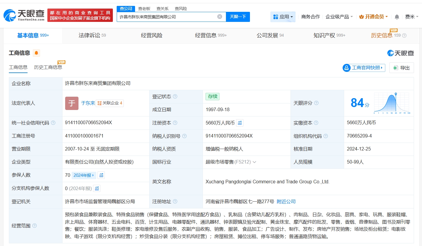 天眼查工商信息显示,胖东来关联企业许昌市胖东来商贸集团有限公司成立于1997年9月,法定代表人为于东来,注册资本5660万人民币,经营范围包括房地产开发销售、场地及柜台租赁、炒货食品分装等。股东信息显示,该公司由于东来、张春兰、于娟等共同持股。控制企业信息显示,该公司控制20家企业,去年,该公司成立了许昌市胖东来梦之城商贸有限公司、禹州市胖东来嘉禾餐饮有限公司、许昌市胖东来食乐汇餐饮有限公司等近十家新公司。
