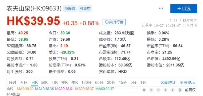 截至发稿前,农夫山泉股价39.95港元,总市值4492.96亿港元。