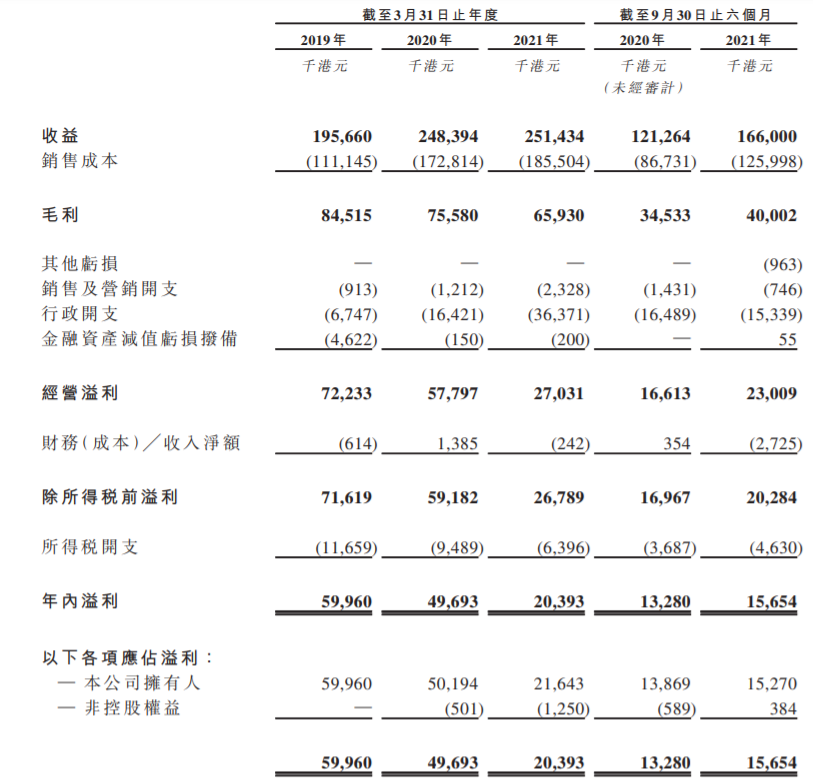 财务方面,其业绩近几年呈现逐年下降趋势。截止3月31日的2019财年、2020财年、2021财年以及今年前九月,公司实现收益1.96亿港元、2.48亿港元、2.51亿港元以及1.66亿港元;相应的净利润为5996万港元、4969.3万港元、2039.3万港元以及1565.4万港元。