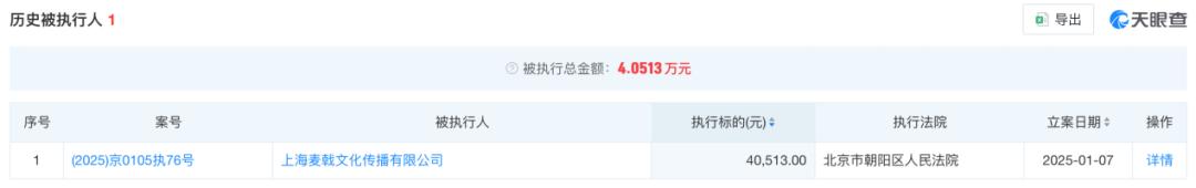 天眼查显示,今年1月,麦戟文化还新增了一则被执行人信息,执行标的约为4万元,执行法院为北京市朝阳区人民法院。