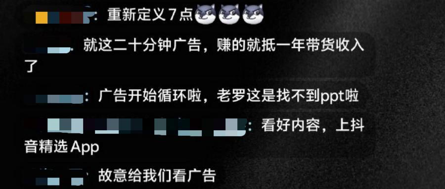 有网友称,在罗永浩迟到期间,会场上循环播放了十几遍广告,包含理想汽车、瑞幸咖啡等品牌。过多的广告引得直播间观众吐槽称:“就这二十分钟广告,赚的就抵一年带货收入了。”
