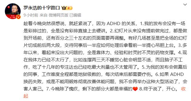 12月31日凌晨,罗永浩通过微博补充解释迟到原因,称受注意缺陷与多动障碍(ADHD)影响,其发布会从未彩排,幻灯片都是制作至开场前,且当前体力下降,长期服用的药物已达最大剂量仍效果不佳,若后续换药失败或无法通过锻炼改善体能问题,将不再举办此类大型活动。