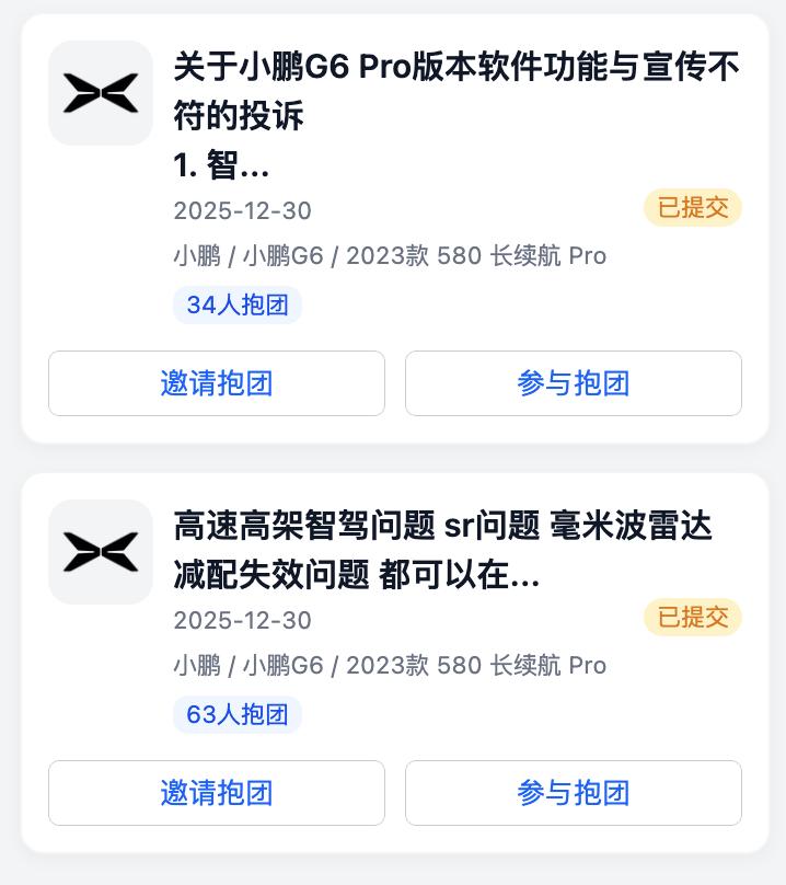 此外,另有33名车主“抱团”反馈小鹏G6 Pro版本软件功能与宣传不符,车主希望小鹏汽车能针对快速路智驾覆盖、高速地图更新、SR功能优化及芯片算力释放等问题,出台具体可行的解决方案。