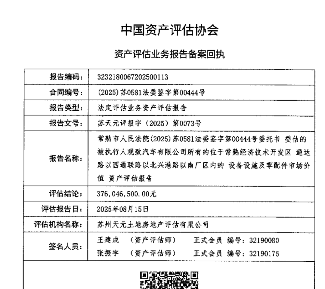 针对估值差异等问题,据“第一财经”1月14日报道,苏州天元相关项目负责人表示,流程上,观致汽车常熟工厂土地、厂房等估价项目均由常熟市人民法院委托至苏州天元,若对估值存疑建议联系法院方面进行解答。