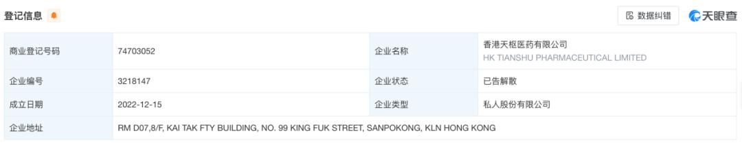 不过,天眼查显示,该号码在香港登记的公司实际名称为“香港天枢医药有限公司”,与“中科中药研究院”不符。