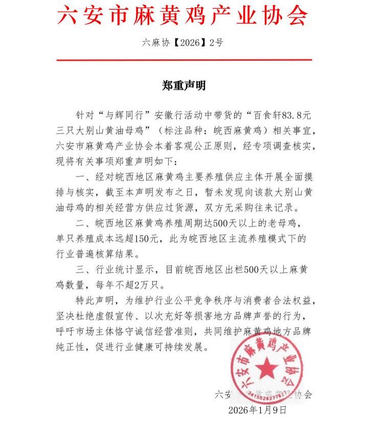 1月9日,六安市麻黄鸡产业协会发布郑重声明,公开质疑该产品并非其宣称的“皖西麻黄鸡”。