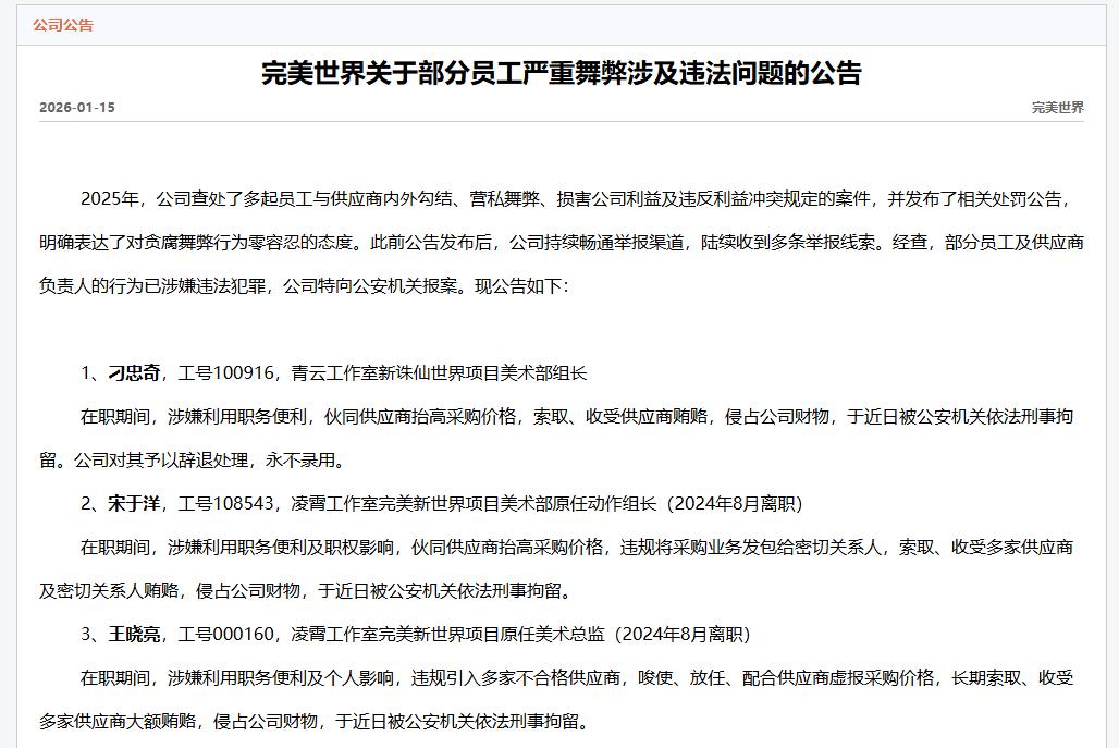 1月15日,完美世界发布公告称,公司3名美术负责人(其中2人已离职)涉嫌严重舞弊,现已被公安依法刑事拘留。