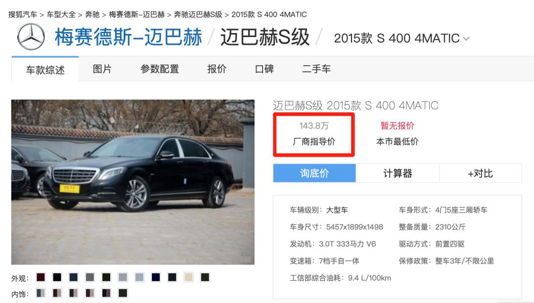 雷达财经查阅第三方网站了解到,该车为迈巴赫S400,其2015款厂商指导价高达140余万元。