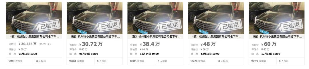 阿里资产平台信息显示,这个名为(破)杭州张小泉集团有限公司名下车牌号为浙AE39G6小型轿车的标的物,最早一次拍卖是在2025年12月1日,起拍价即为评估价60万元,但于次日流拍。