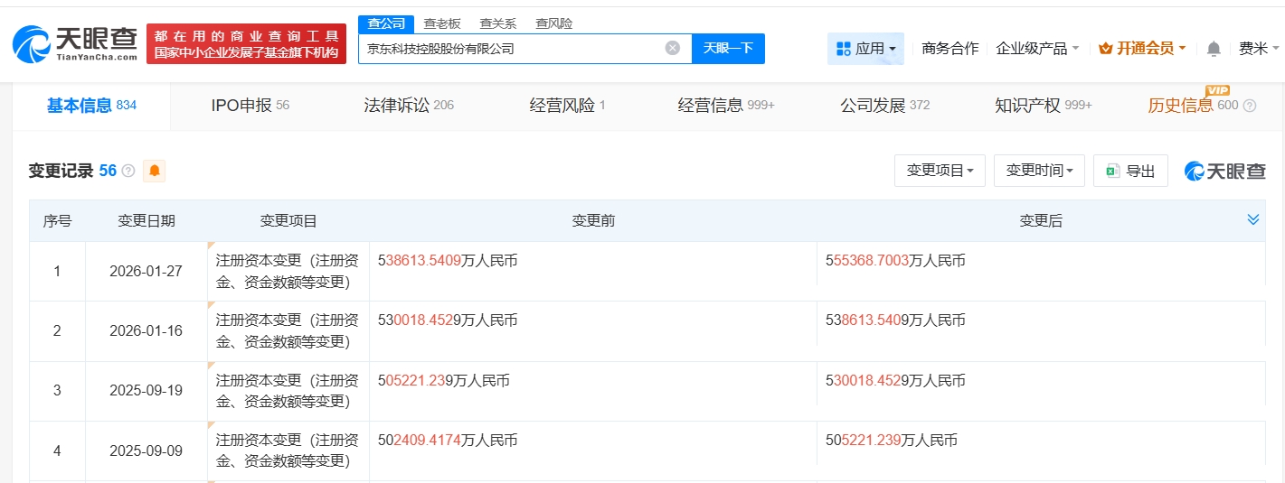雷达财经讯,天眼查工商信息显示,近日,京东科技控股股份有限公司发生工商变更,注册资本由约53.9亿人民币增至约55.5亿人民币。值得一提的是,自去年9月以来,该公司已多次增资。