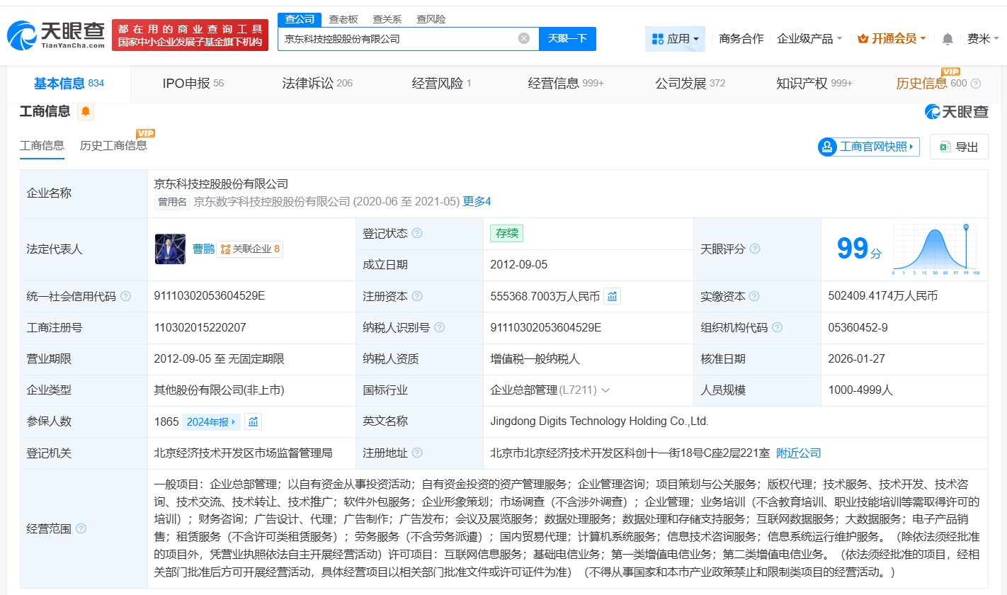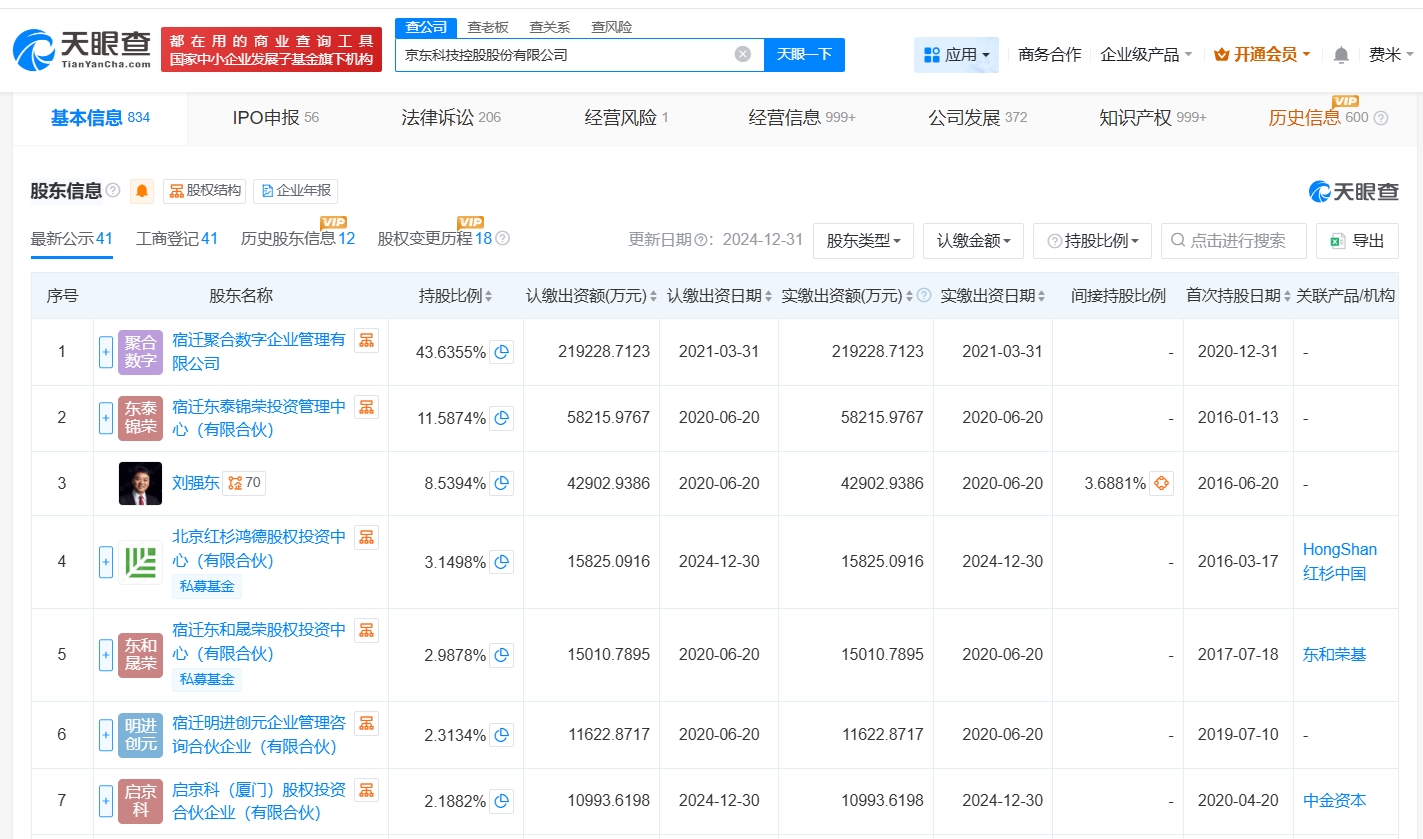 京东科技控股股份有限公司成立于2012年9月,法定代表人为曹鹏,经营范围包括企业总部管理、以自有资金从事投资活动、自有资金投资的资产管理服务、企业管理咨询等。股东信息显示,该公司由宿迁聚合数字企业管理有限公司、宿迁东泰锦荣投资管理中心(有限合伙)、刘强东等共同持股。