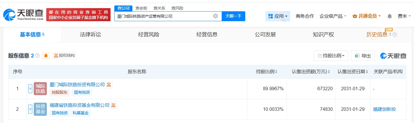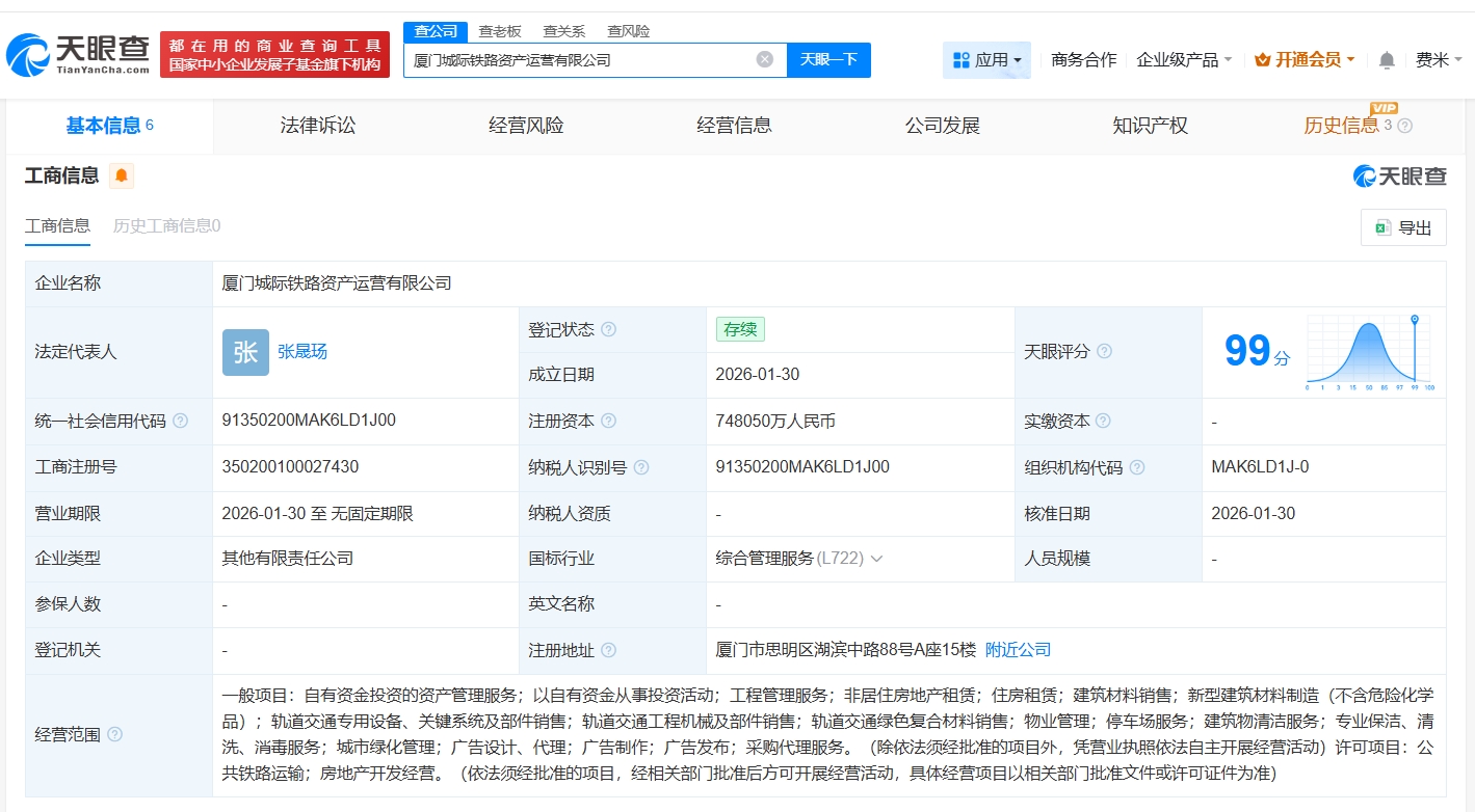 雷达财经讯,天眼查App显示,1月30日,厦门城际铁路资产运营有限公司成立,法定代表人为张晟玚,注册资本约74.8亿人民币,经营范围包括自有资金投资的资产管理服务、以自有资金从事投资活动、工程管理服务、非居住房地产租赁等,由厦门城际铁路投资有限公司、福建省铁路投资基金有限公司共同持股。
