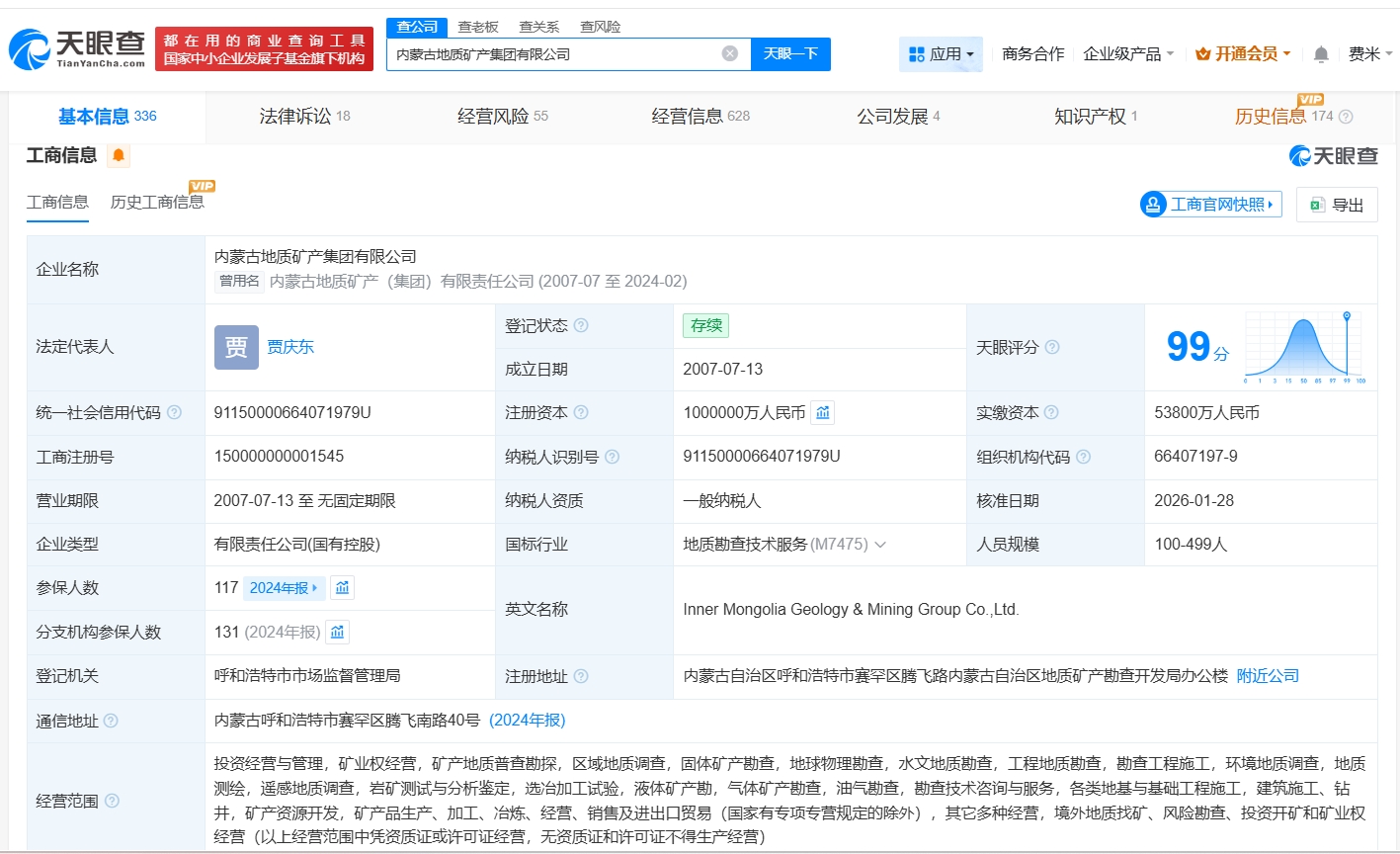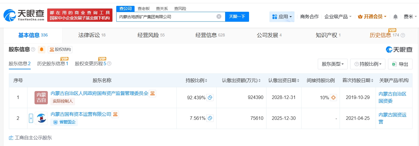 该公司成立于2007年7月,法定代表人为贾庆东,经营范围包括投资经营与管理、矿业权经营、矿产地质普查勘探、区域地质调查等,由内蒙古自治区人民政府国有资产监督管理委员会、内蒙古国有资本运营有限公司共同持股。