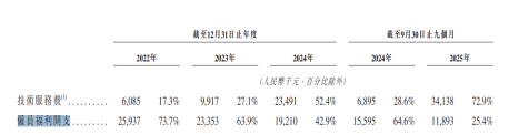 进一步研究发现,公司研发开支的内部结构发生变化。公司的员工福利开支逐年下滑,由2022年的0.26亿元降至2024年的0.19亿元,占研发开支的比例由73.7%下滑至42.9%。2025年前三季度,该金额为0.12亿元,同比下滑24%,占比由2024年同期的64.6%降至25.4%。