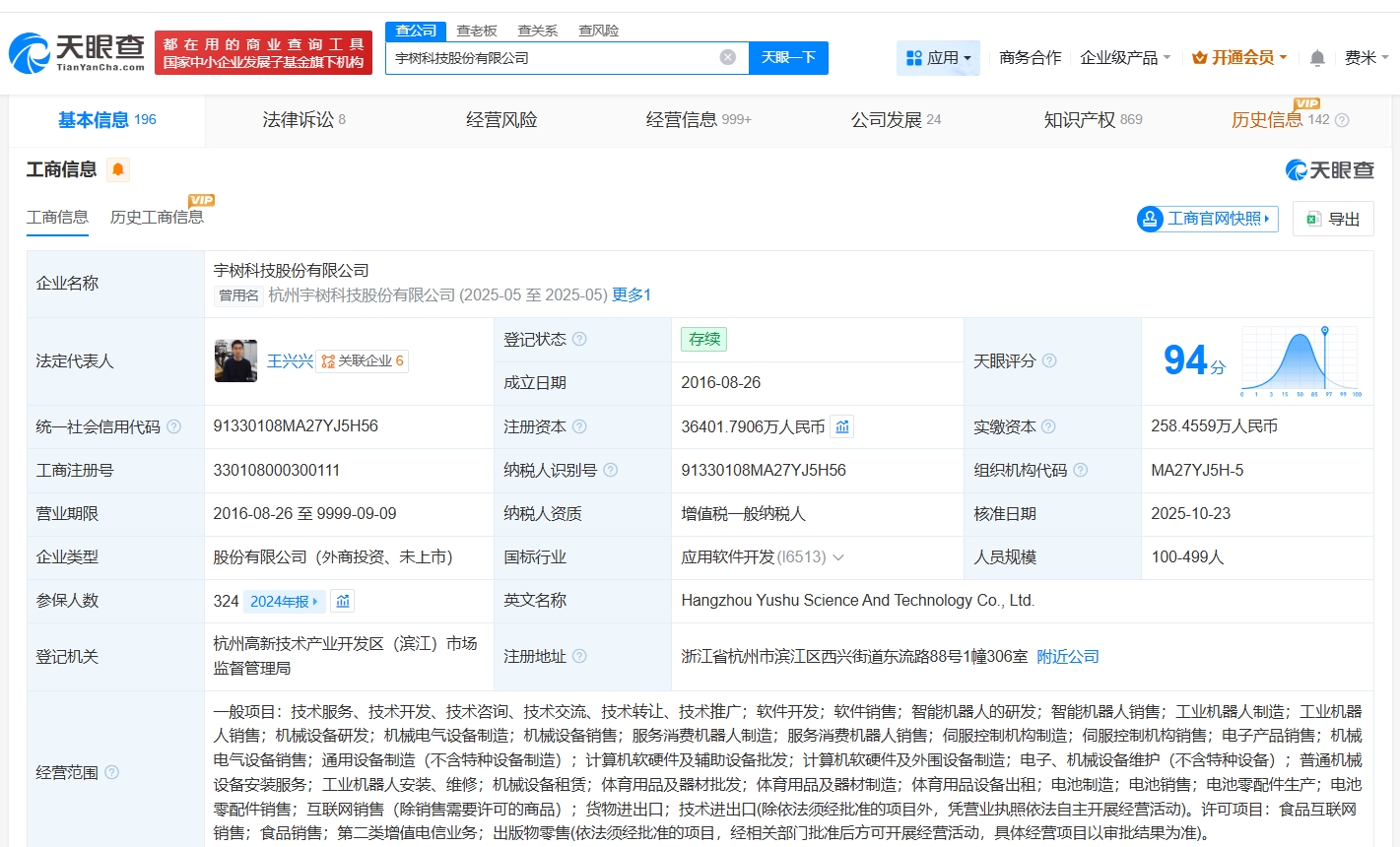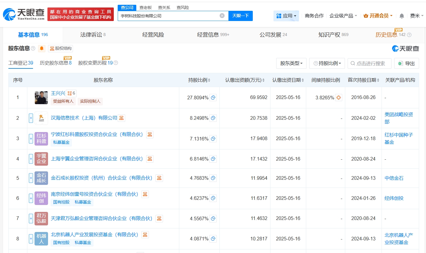 宇树科技股份有限公司成立于2016年8月,法定代表人为王兴兴,注册资本约3.64亿人民币,经营范围包括智能机器人的研发、智能机器人销售、工业机器人制造等。股东信息显示,该公司由王兴兴、汉海信息技术(上海)有限公司、宁波红杉科盛股权投资合伙企业(有限合伙)等共同持股。
