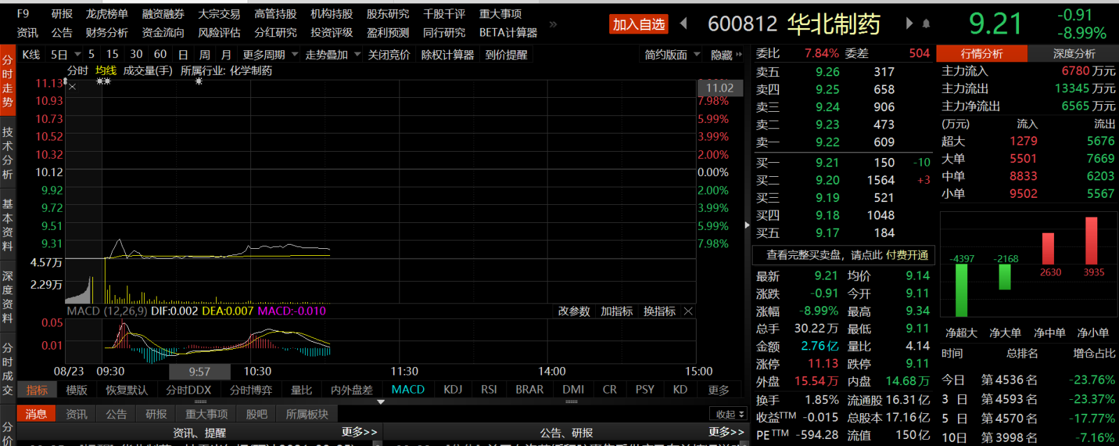 二级市场上,23日开盘,华北制药(600812)跌停报9.11元,随后开板,目前跌近9%。
