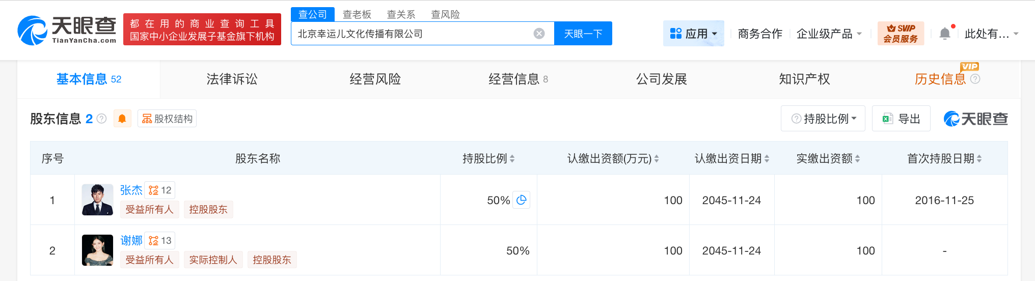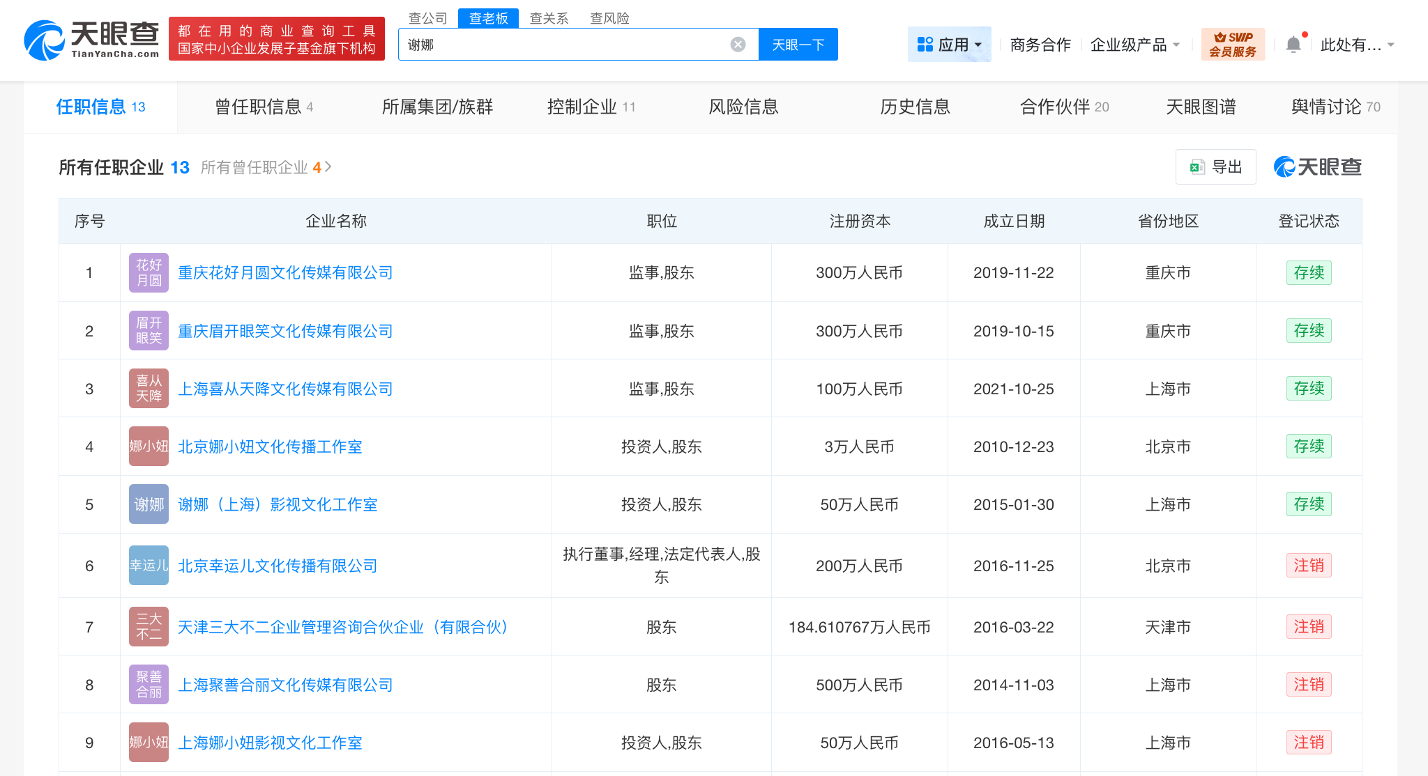 天眼查任职信息显示,谢娜名下关联13家企业,其中5家为存续状态,包括重庆花好月圆文化传媒有限公司、重庆眉开眼笑文化传媒有限公司、上海喜从天降文化传媒有限公司等,涵盖影视文化、传媒等领域,值得一提的是,谢娜与张杰曾于2016年11月共同成立北京幸运儿文化传播有限公司,注册资本200万人民币,经营范围包括组织文化艺术交流活动、企业策划、会议服务等。股东信息显示,该公司由张杰、谢娜各持股50%,不过,该企业已于2018年11月注销。