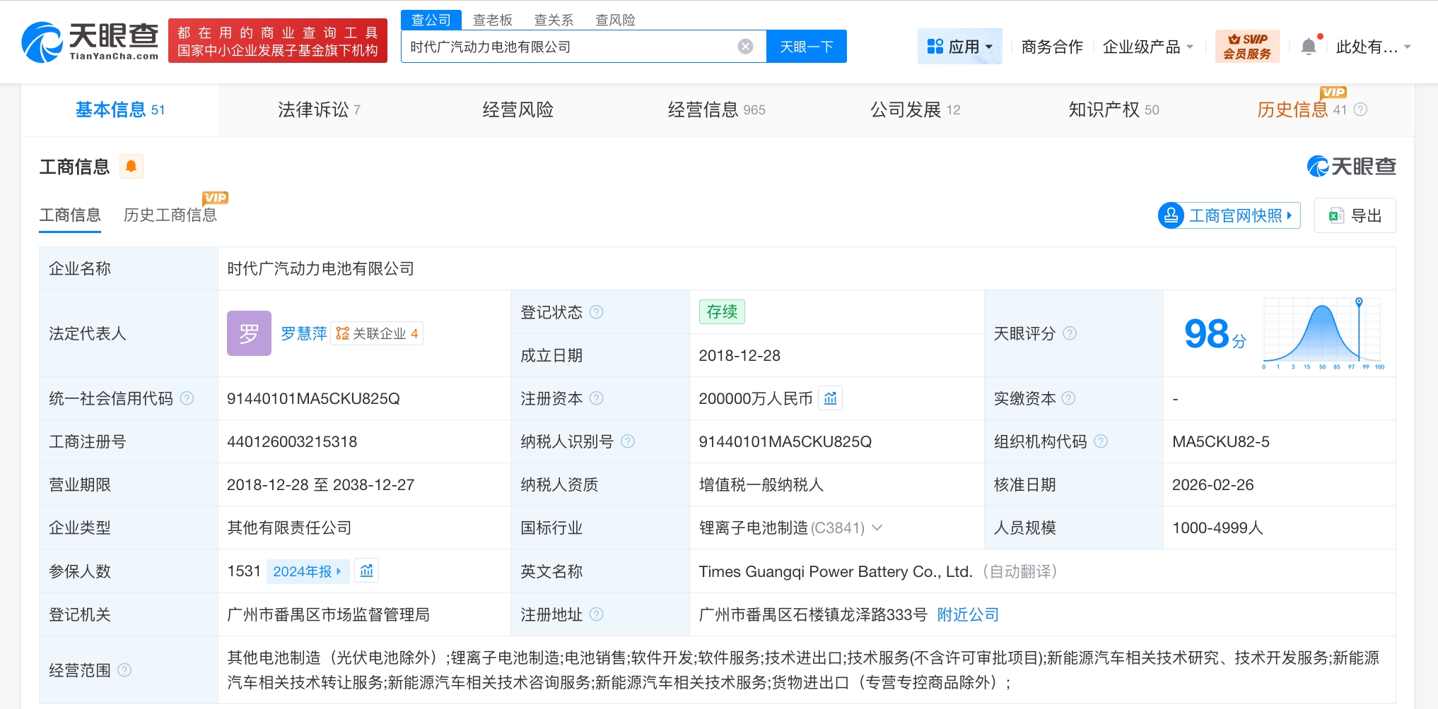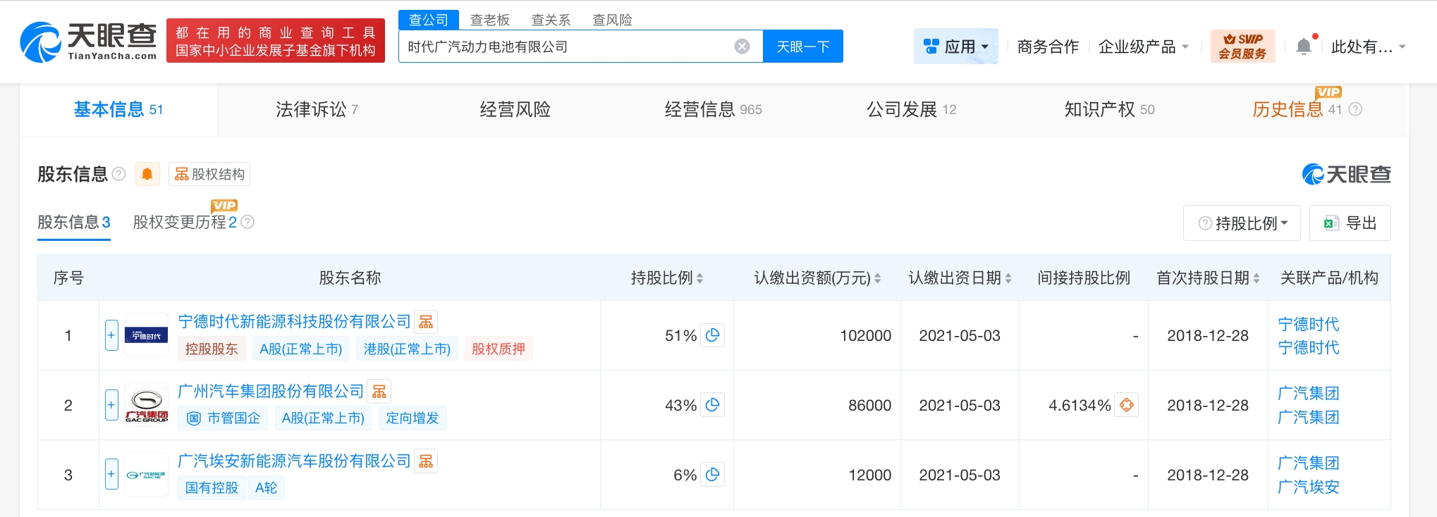 时代广汽动力电池有限公司成立于2018年12月,注册资本20亿人民币,经营范围为其他电池制造、锂离子电池制造、电池销售、软件开发、软件服务、技术进出口、技术服务等。股东信息显示,该公司由宁德时代(300750)、广汽集团(601238)及旗下广汽埃安新能源汽车股份有限公司共同持股。