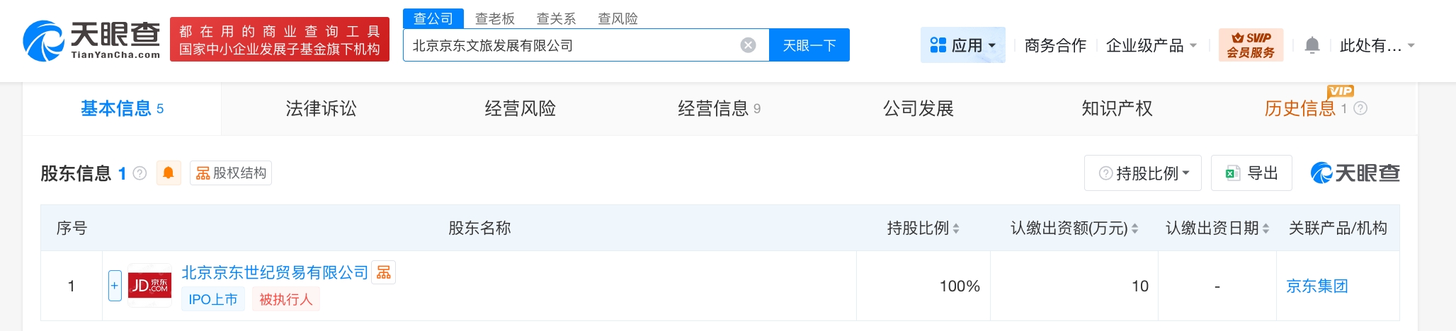 雷达财经讯,天眼查工商信息显示,近期,北京京东文旅发展有限公司成立,法定代表人为张一泓,注册资本10万人民币,经营范围含旅游业务、歌舞娱乐活动、旅客票务代理、航空商务服务、体验式拓展活动及策划、组织文化艺术交流活动、企业总部管理、票务代理服务、规划设计管理、旅游开发项目策划咨询等。股东信息显示,该公司由北京京东世纪贸易有限公司全资持股。