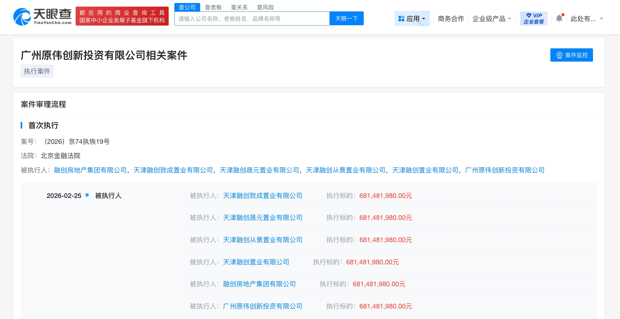 雷达财经讯,天眼查法律诉讼信息显示,2月25日,融创房地产集团有限公司新增2条被执行人信息,执行标的合计6.8亿余元,被执行人还包括天津融创致成置业有限公司、天津融创晟元置业有限公司等,执行法院为北京金融法院、昆明市官渡区人民法院。