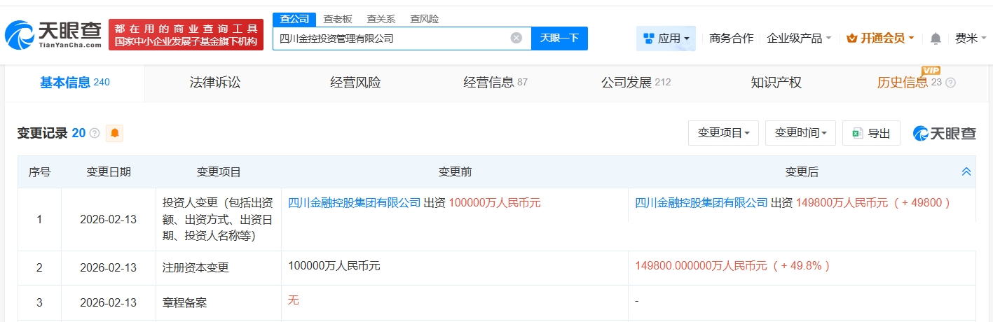 雷达财经讯,天眼查App显示,近日,四川金控投资管理有限公司发生工商变更,注册资本由10亿人民币增至14.98亿人民币,增幅约50%。