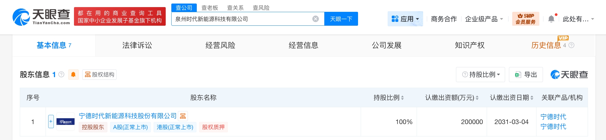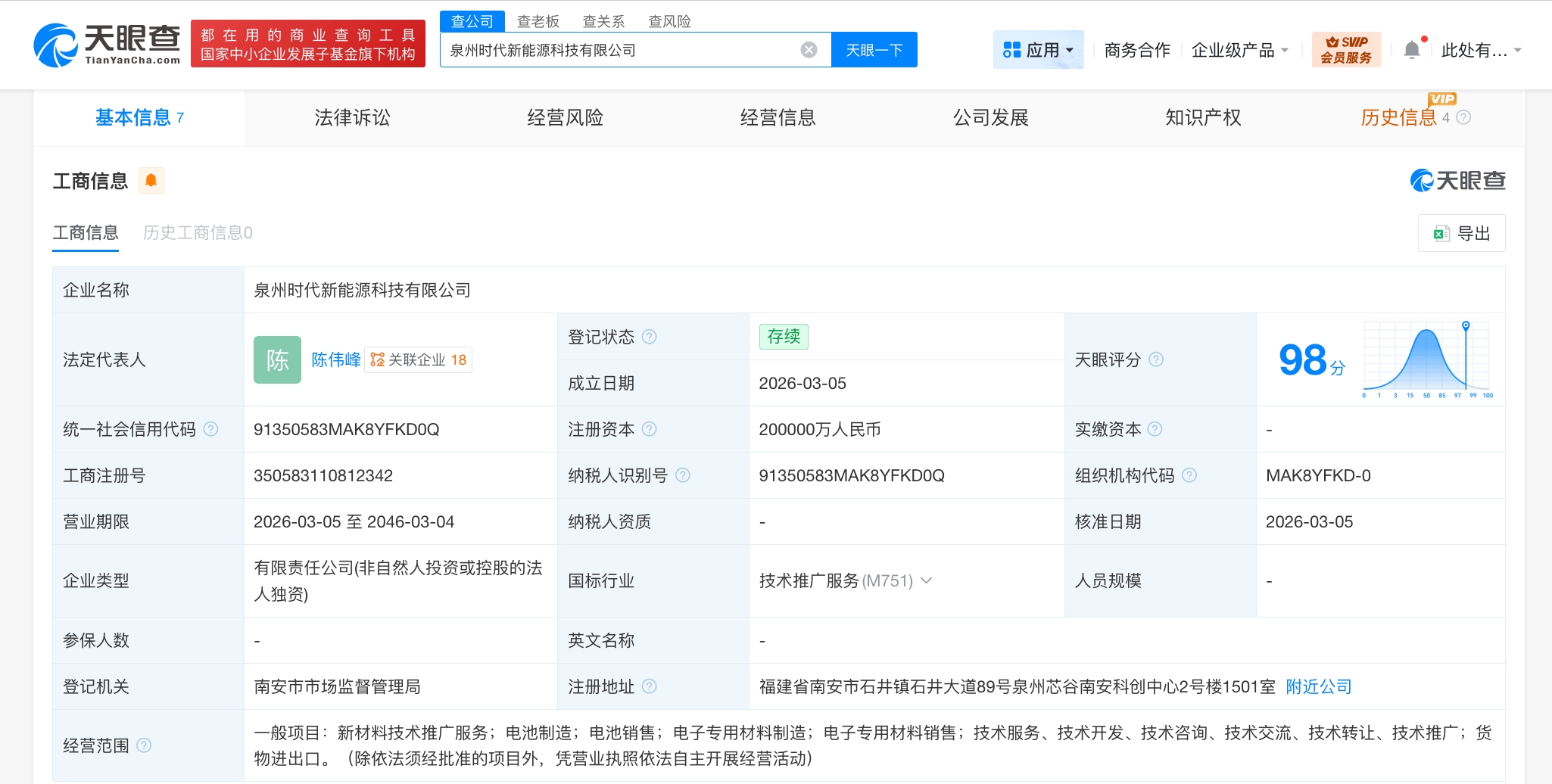 雷达财经讯,天眼查工商信息显示,近日,泉州时代新能源科技有限公司成立,法定代表人为陈伟峰,注册资本20亿人民币,经营范围为新材料技术推广服务,电池制造,电池销售,电子专用材料制造,电子专用材料销售,技术服务、技术开发、技术咨询、技术交流、技术转让、技术推广,货物进出口。股东信息显示,该公司由宁德时代(300750)全资持股。