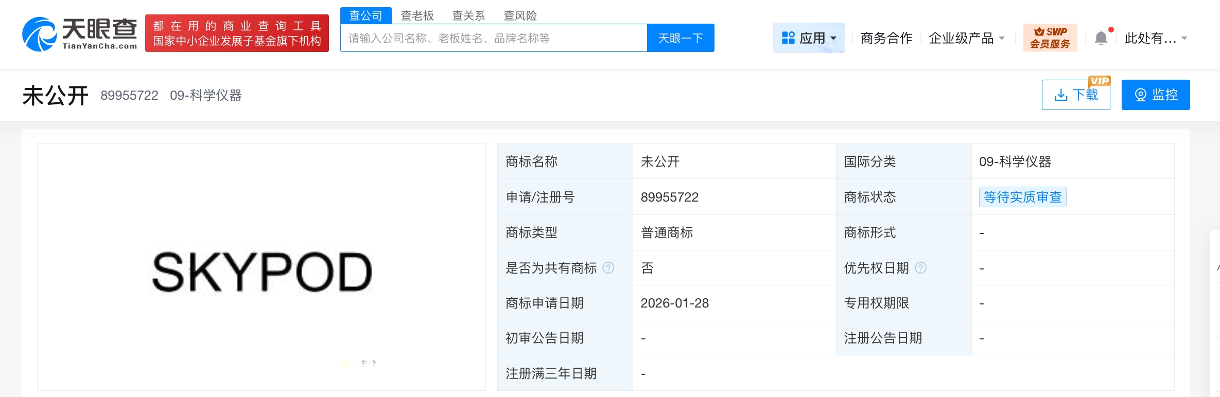 雷达财经讯,天眼查知识产权信息显示,近日,苹果公司申请注册一枚“SKYPOD”商标,国际分类为科学仪器,当前商标状态为等待实质审查。