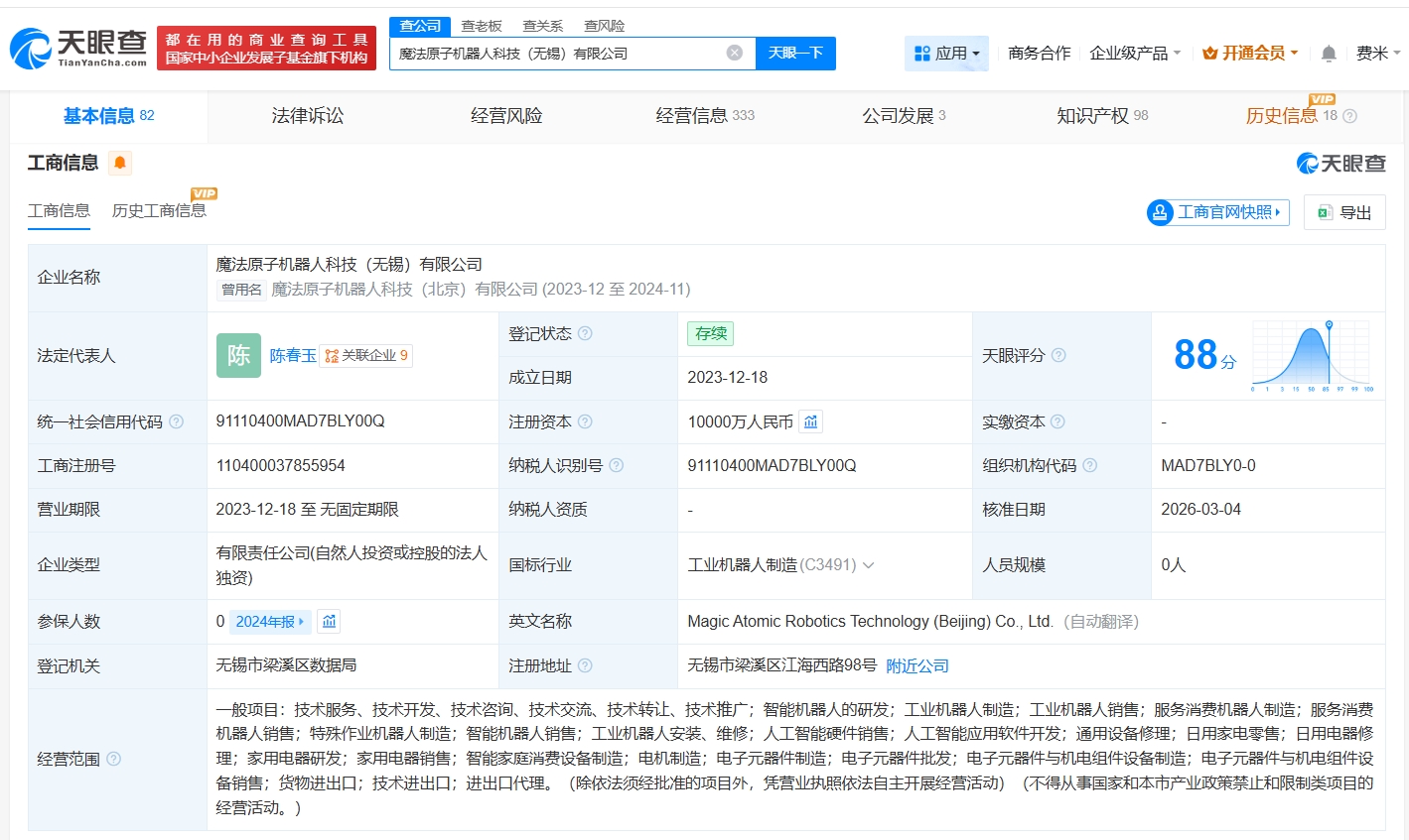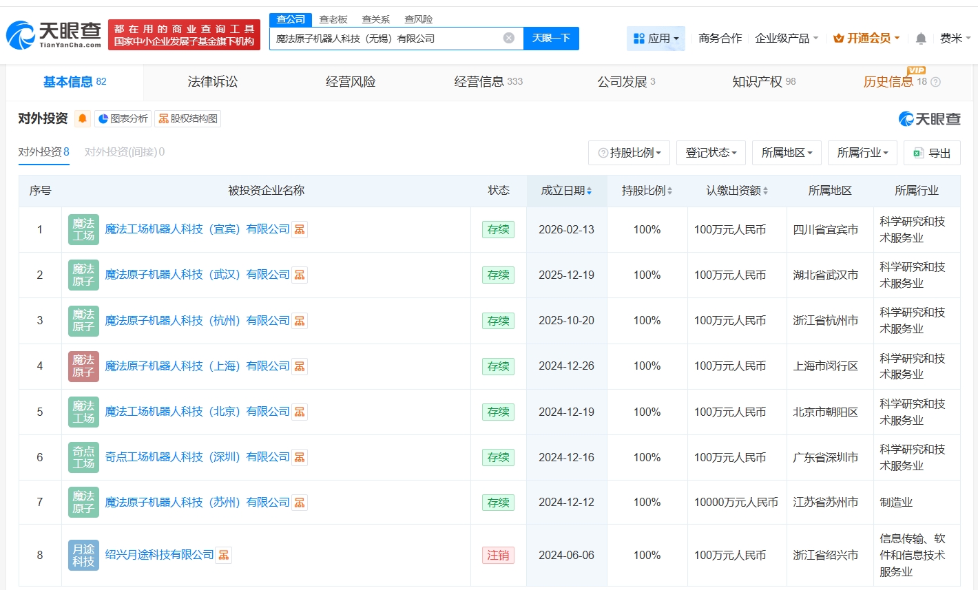 天眼查工商信息显示,魔法原子机器人关联公司魔法原子机器人科技(无锡)有限公司成立于2023年12月,经营范围包括智能机器人的研发、工业机器人制造、工业机器人销售等。股东信息显示,该公司由魔法工场(无锡)科技有限公司全资持股。变更记录显示,近期,该公司发生工商变更,创始人吴长征卸任法定代表人,由陈春玉接任。去年12月,该公司注册资本由1000万人民币增至1亿人民币。对外投资信息显示,该公司对外投资8家企业,去年10月以来,该公司成立了魔法工场机器人科技(宜宾)有限公司、魔法原子机器人科技(武汉)有限公司、魔法原子机器人科技(杭州)有限公司。