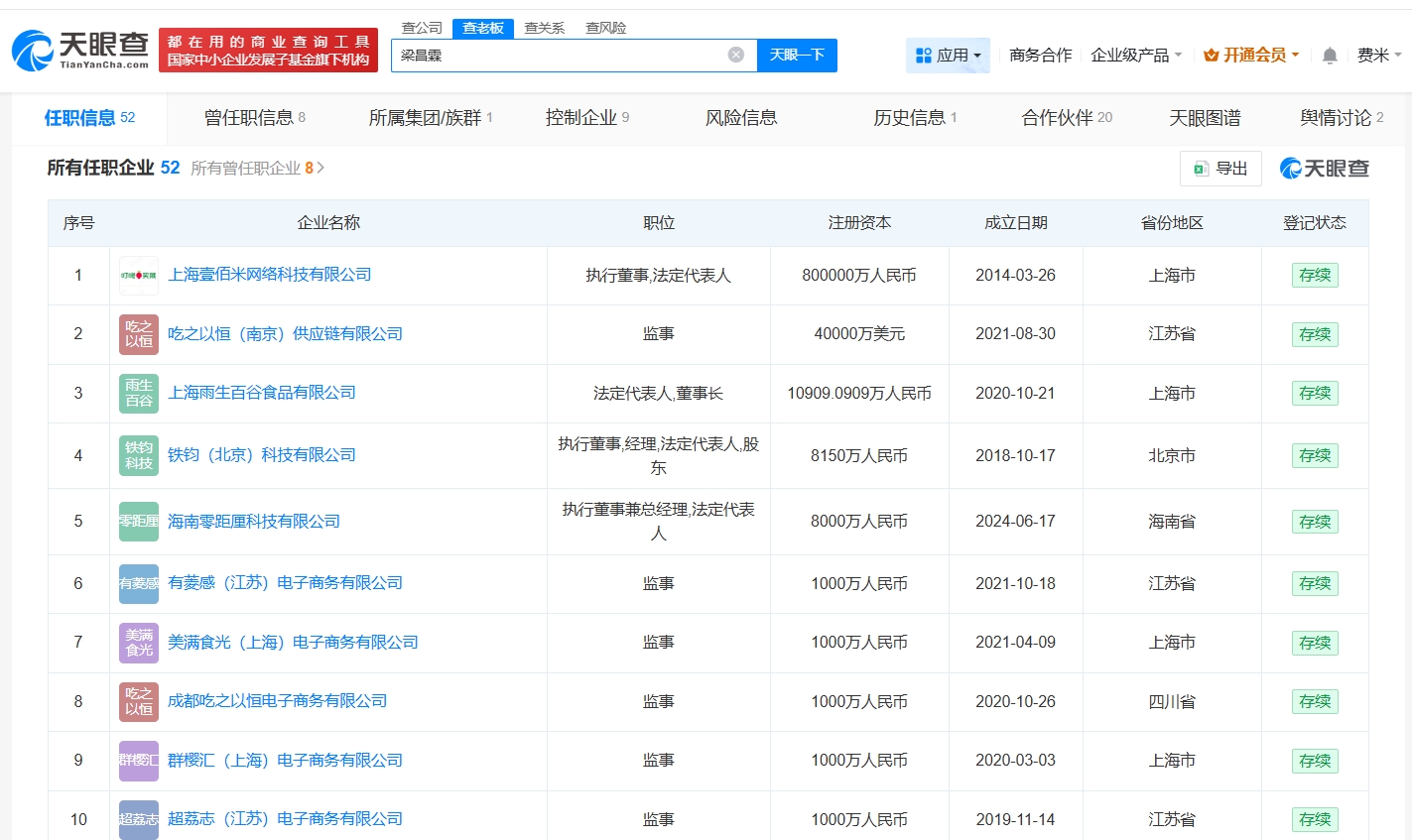 天眼查任职信息显示,梁昌霖名下关联52家企业,其中20余家企业处于存续状态,包括上海壹佰米网络科技有限公司、吃之以恒(南京)供应链有限公司、上海雨生百谷食品有限公司等,梁昌霖在上述企业担任执行董事、监事等职务,其他20余家企业已注销。