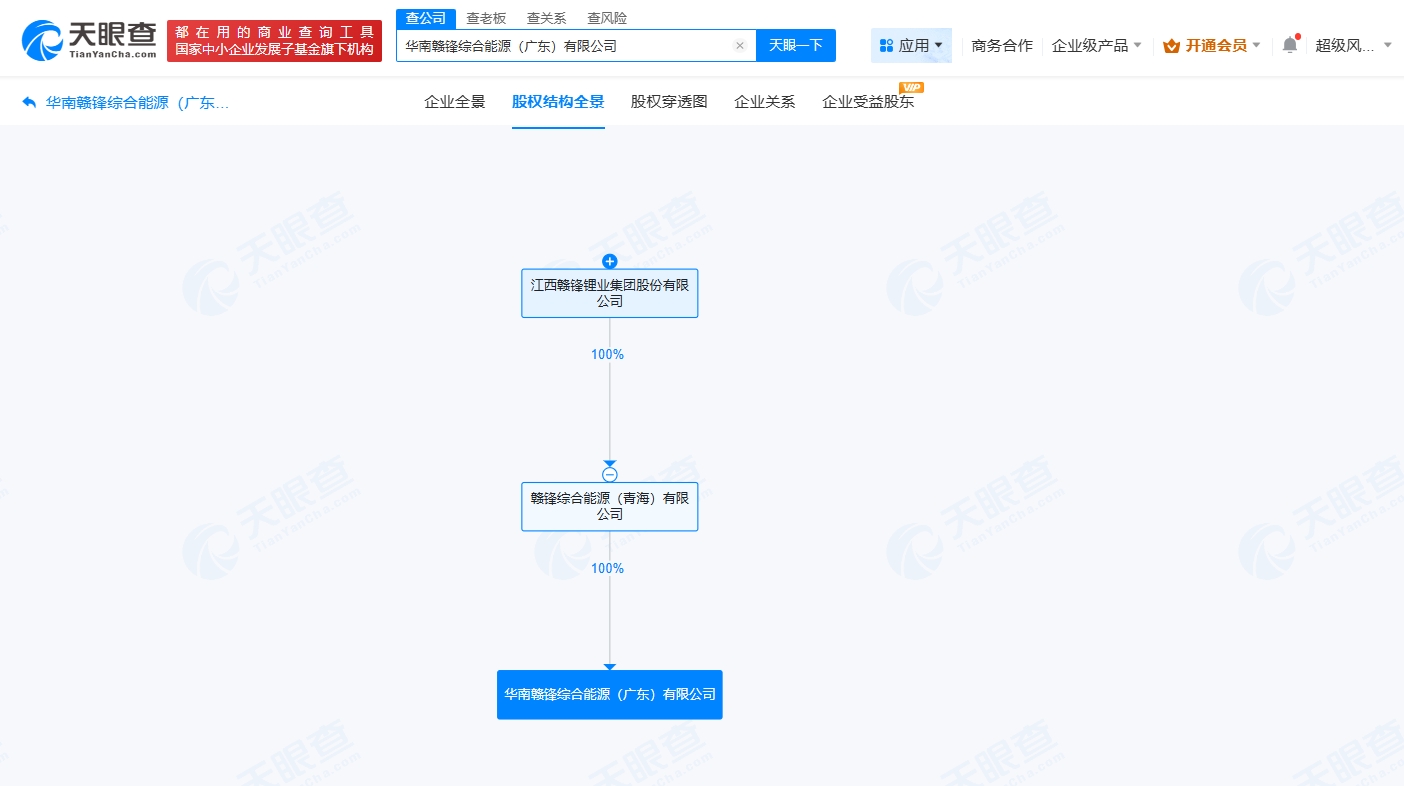 雷达财经讯,天眼查工商信息显示,近日,华南赣锋综合能源(广东)有限公司成立,法定代表人为黄腾飞,注册资本5000万人民币,经营范围包括储能技术服务、新兴能源技术研发、在线能源监测技术研发、能量回收系统研发等。股权全景穿透图显示,该公司由赣锋锂业(002460)旗下赣锋综合能源(青海)有限公司全资持股。