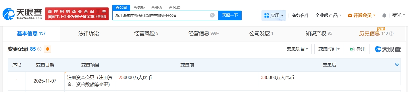 雷达财经讯,天眼查工商信息显示,近日,浙江浙能中煤舟山煤电有限责任公司发生工商变更,注册资本由25亿人民币增至38亿人民币,增幅52%。
