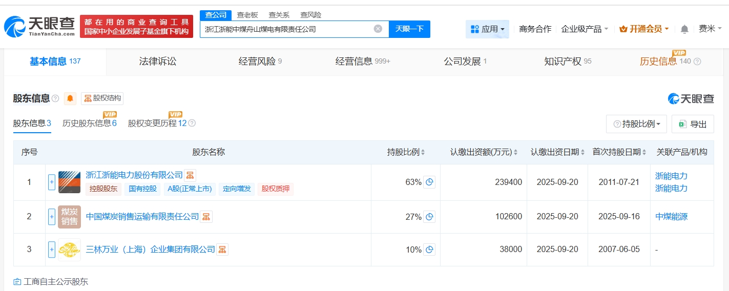 该公司成立于2007年6月,法定代表人为朱青国,经营范围包括城市基础设施类项目的开发建设和运营、配电网建设与经营等。股东信息显示,该公司由浙能电力(600023)、中国煤炭销售运输有限责任公司、三林万业(上海)企业集团有限公司共同持股。
