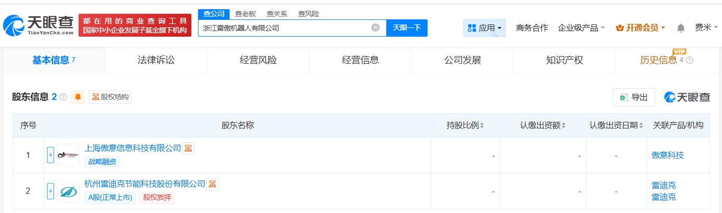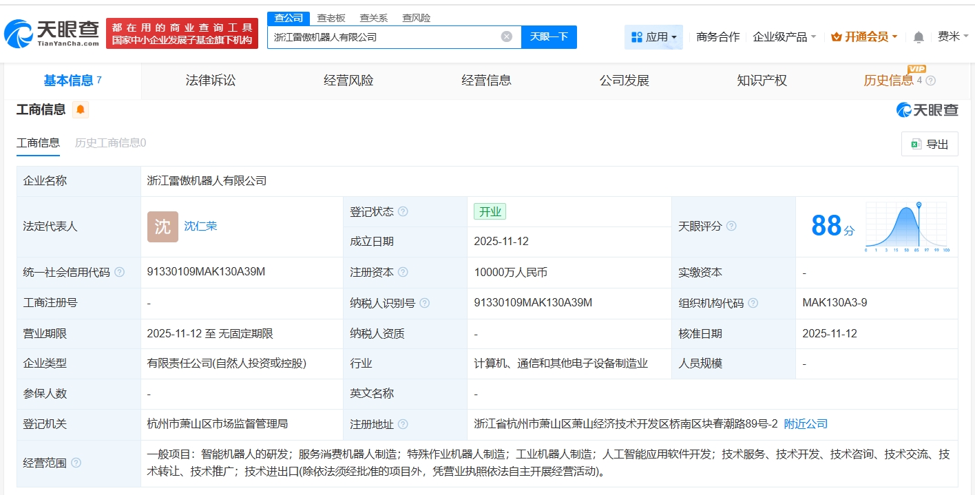 雷达财经讯,天眼查工商信息显示,近日,浙江雷傲机器人有限公司成立,法定代表人为沈仁荣,注册资本1亿人民币,经营范围包括智能机器人的研发、服务消费机器人制造、特殊作业机器人制造等。股东信息显示,该公司由上海傲意信息科技有限公司、雷迪克(300652)共同持股。