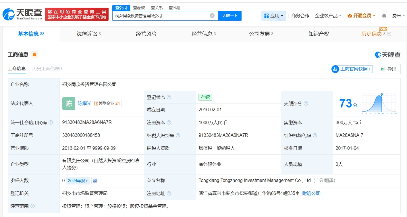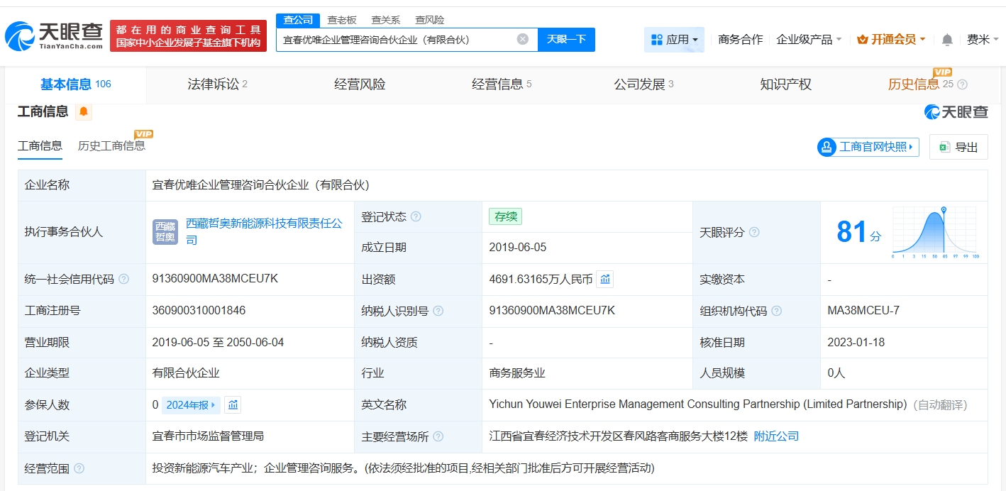 宜春优唯企业管理咨询合伙企业(有限合伙)成立于2019年6月,执行事务合伙人为西藏哲奥新能源科技有限责任公司,出资额约4692万人民币,经营范围为投资新能源汽车产业、企业管理咨询服务,由哪吒汽车原CEO张勇、戴大力、孔繁龙等共同出资,其中张勇出资比例约21.5%。桐乡同众投资管理有限公司成立于2016年2月,法定代表人为陈耀光,注册资本1000万人民币,经营范围为投资管理、资产管理、股权投资、股权投资基金管理。股东信息显示,该公司由上海哲奥实业有限公司全资持股,后者由方运舟持股约58%。对外投资信息显示,上述两家企业直接或间接持有哪吒汽车关联公司合众新能源汽车股份有限公司股份。