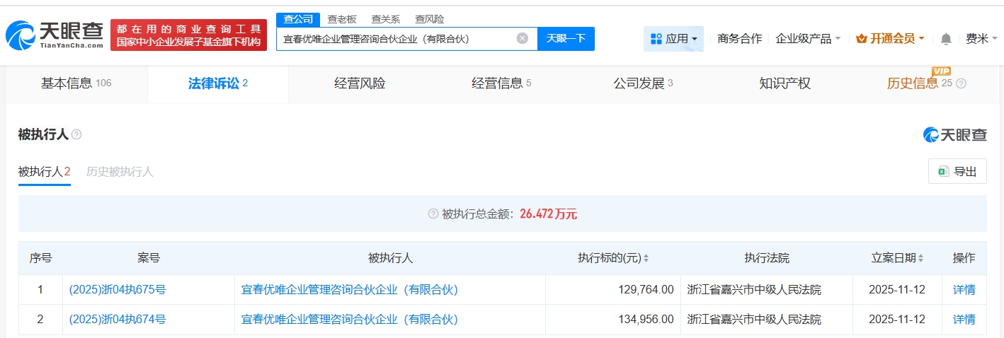 雷达财经讯,天眼查天眼风险信息显示,近日,宜春优唯企业管理咨询合伙企业(有限合伙)、桐乡同众投资管理有限公司新增两则被执行人信息,执行标的合计26万余元,执行法院均为浙江省嘉兴市中级人民法院。