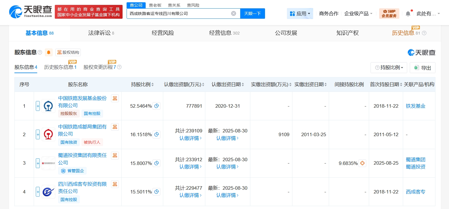 该公司成立于2011年5月,法定代表人为王在广,经营范围含公共铁路运输、建设工程施工、房地产开发经营、国内货物运输代理等。股东信息显示,该公司由中国铁路发展基金股份有限公司、中国铁路成都局集团有限公司、蜀道投资集团有限责任公司、四川西成客专投资有限责任公司共同持股。