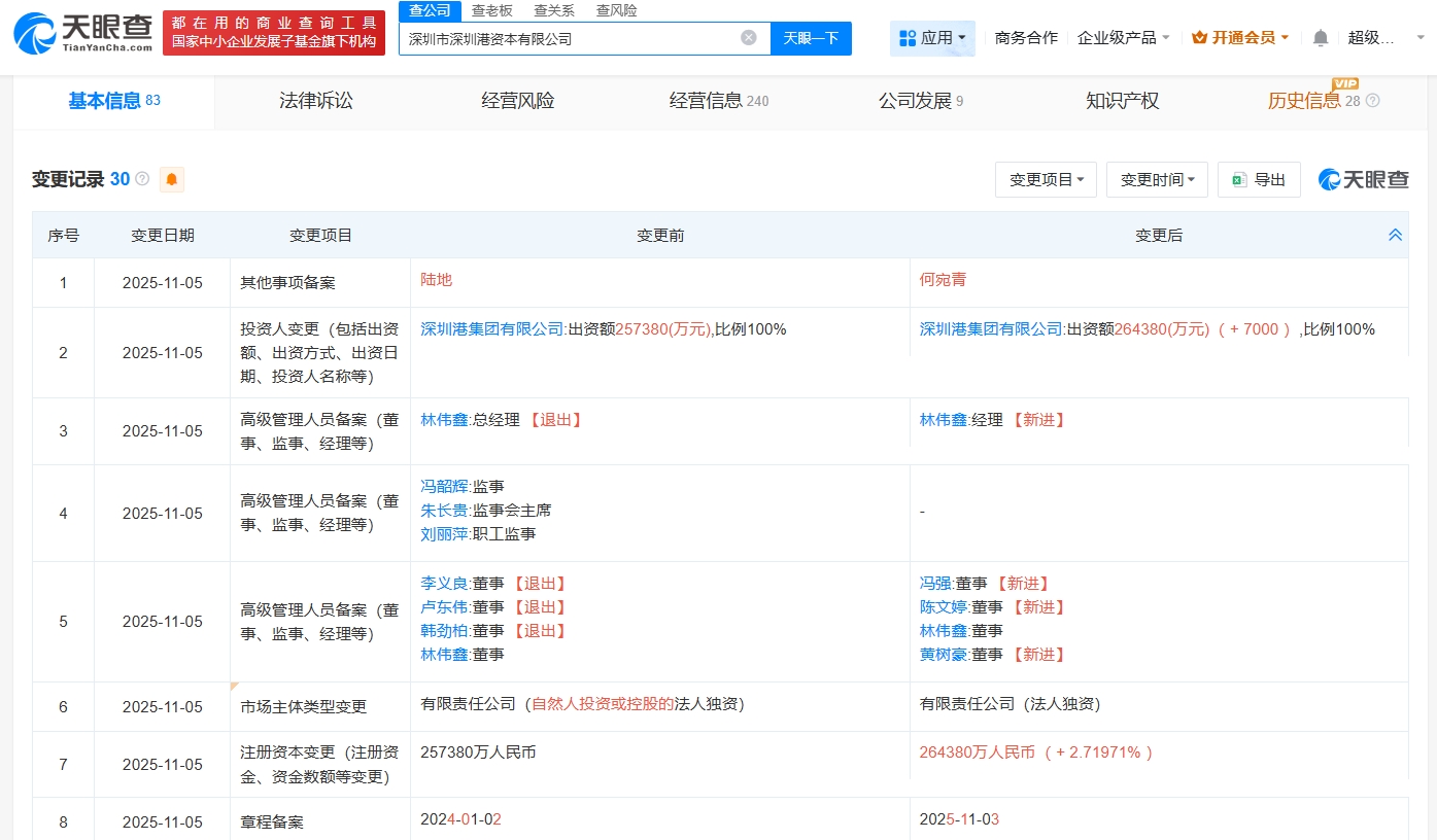 雷达财经讯,天眼查App显示,近日,深圳市深圳港资本有限公司发生工商变更,注册资本由约25.7亿人民币增至约26.4亿人民币,同时部分主要人员发生变更。