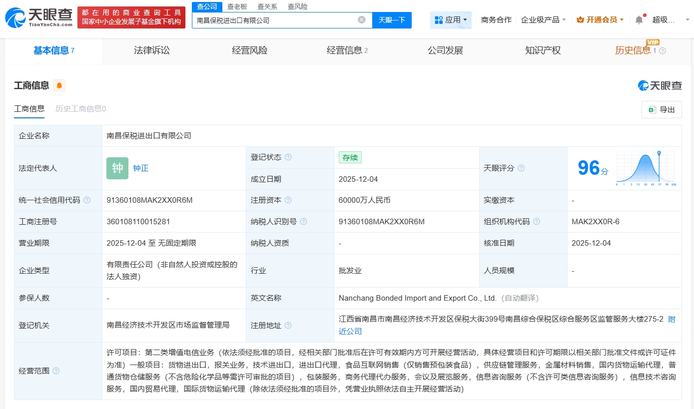 雷达财经讯,天眼查App显示,近日,南昌保税进出口有限公司成立,法定代表人为钟正,注册资本6亿人民币,经营范围包括货物进出口、报关业务、技术进出口、进出口代理等。股东信息显示,该公司由南昌保税产业投资发展有限公司全资持股。